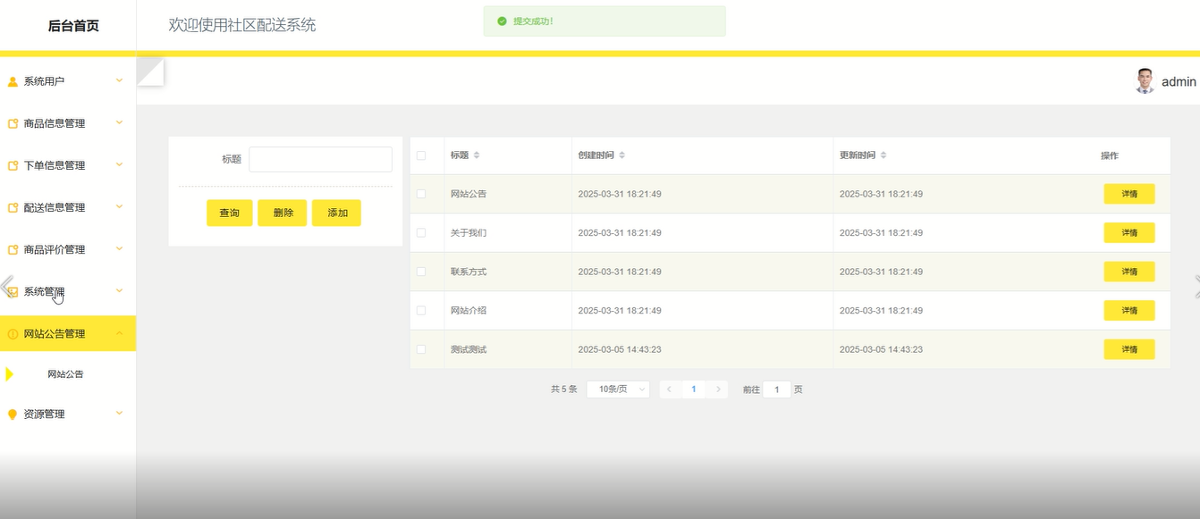 管理员点击“网站公告管理”这个菜单,可以对系统中的网站公告信息进行管理,包括网站公告信息的增删改查等操作。网站公告管理界面如下图所示。