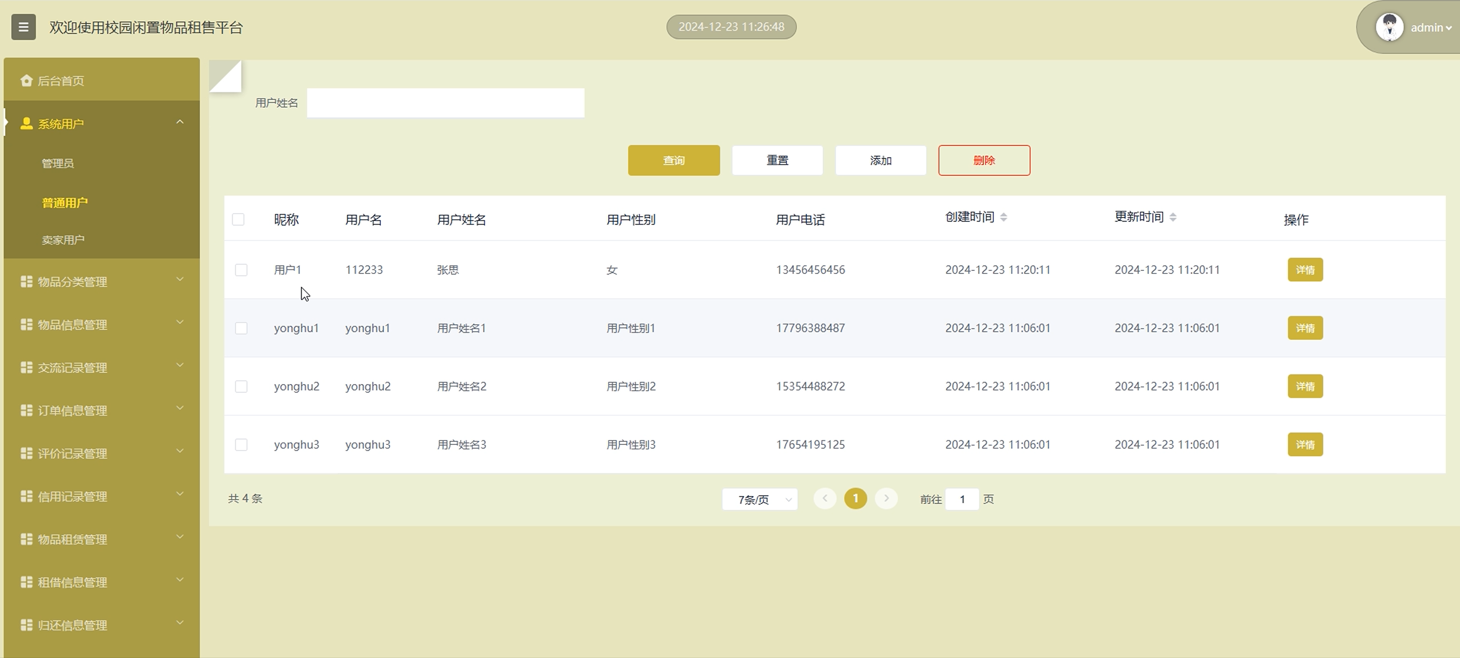 在基于Node.js的校园闲置物品租售平台设计与实现中,我们通过普通用户、卖家和管理员等角色的划分,实现了多层次的用户管理和权限控制。通过物品信息管理、订单管理等功能模块,提供了便捷高效的交易体验。同时,新闻资讯管理、交流记录管理、订单评价管理等功能的引入,进一步增强了平台的交互性和用户满意度,有效保障了交易的公平性和平台的稳定运行。资源管理和通知公告的实施,不仅丰富了平台的内容,也促进了用户之间的信息交流与互动。