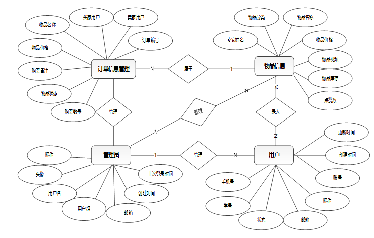 本文在系统分析阶段就抽取了一些实体,根据实体之间的关系,经过分析进行系统E-R图的设计。校园闲置物品租售平台总体E-R图如下图所示。