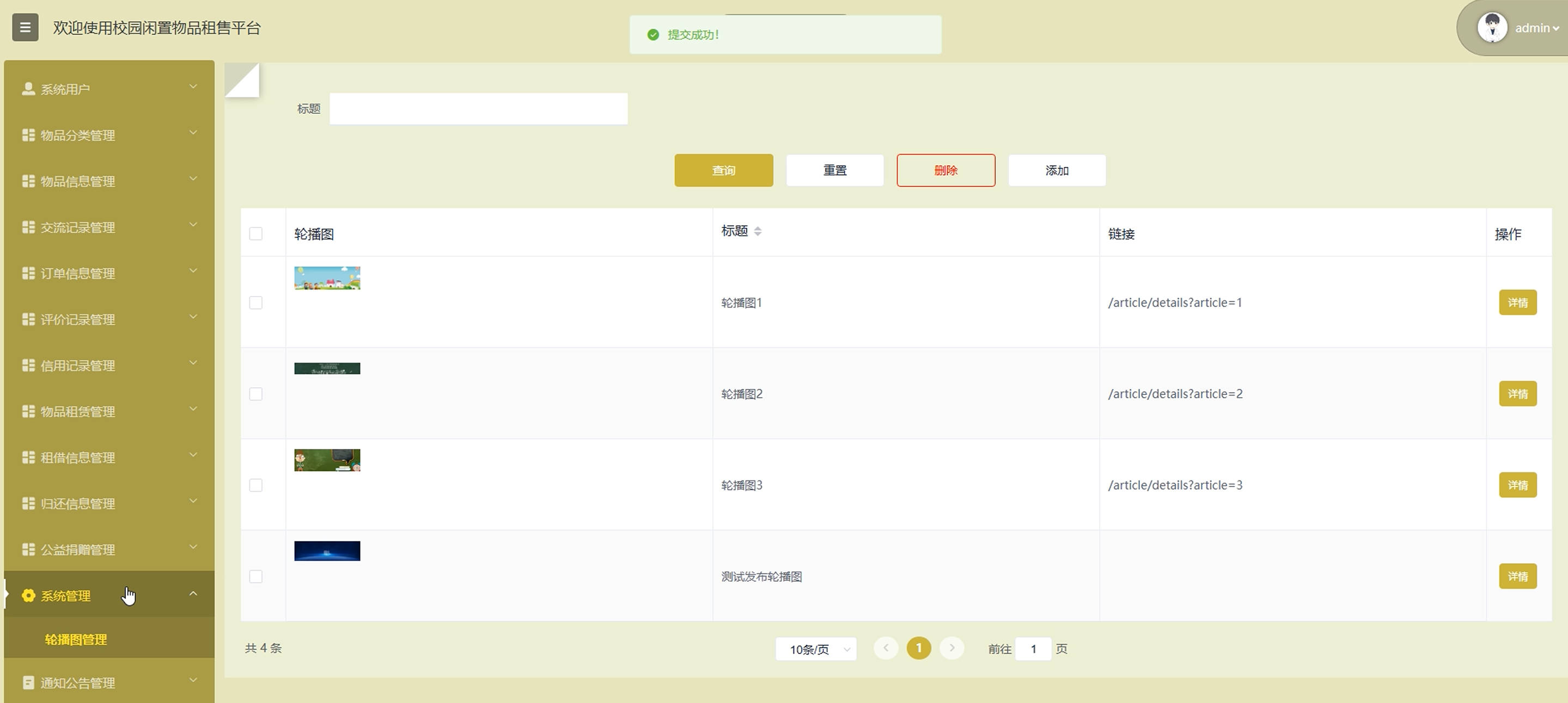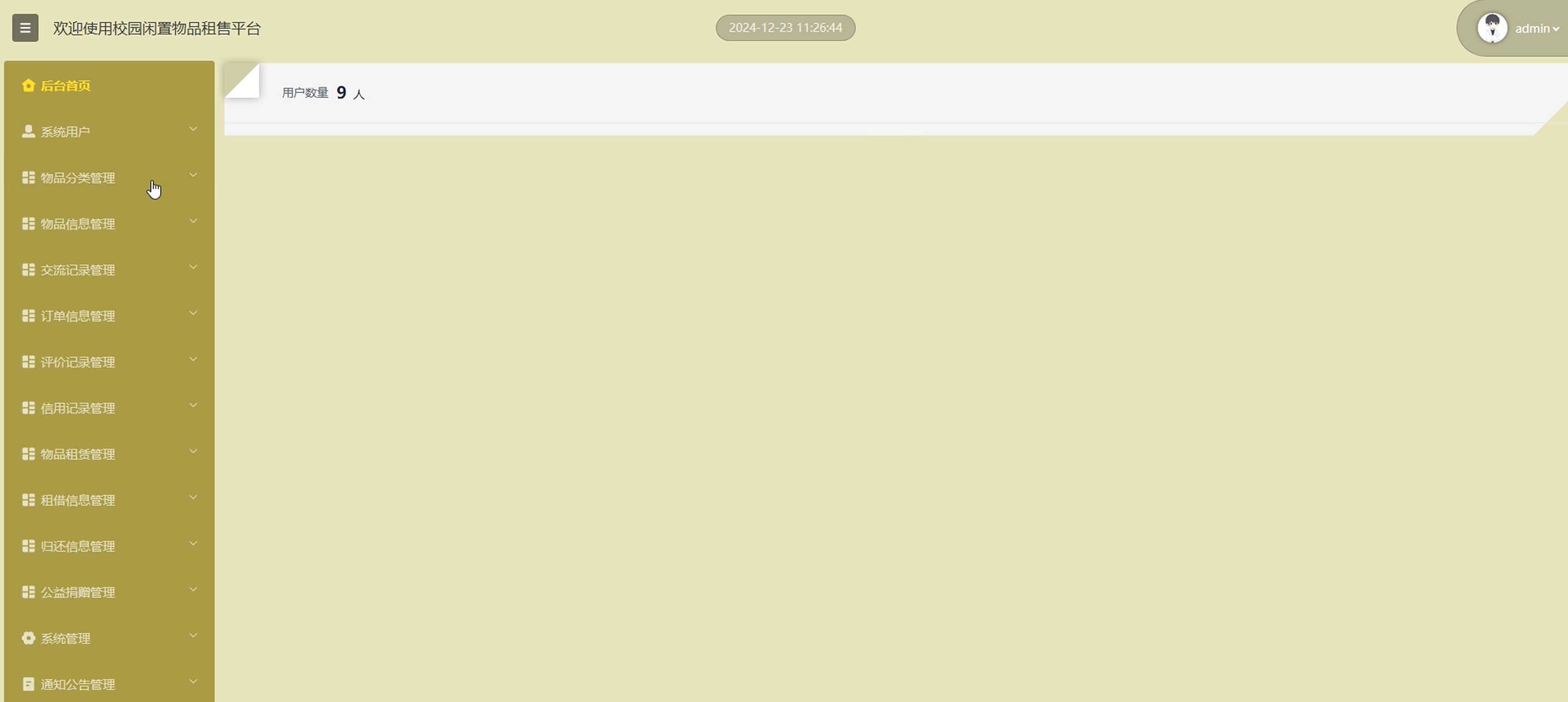 - 普通用户:可以在线交流沟通,浏览公告和物品信息列表,搜索物品信息,下单购买支付、查看订单状态,评价等功能。查看物品租赁详情,并进行租借、评论、点赞等操作。