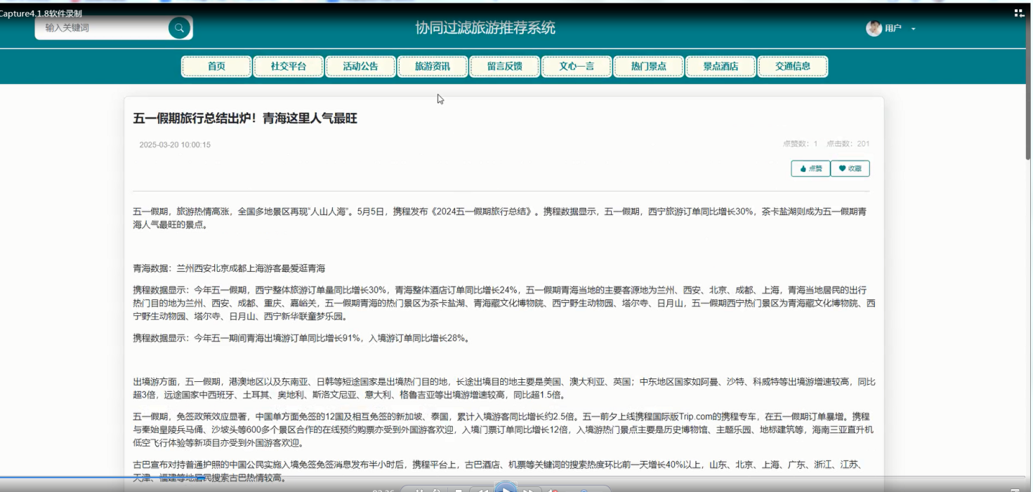 关键词:用户行为;协同过滤;旅游推荐系统;Django框架;个性化推荐