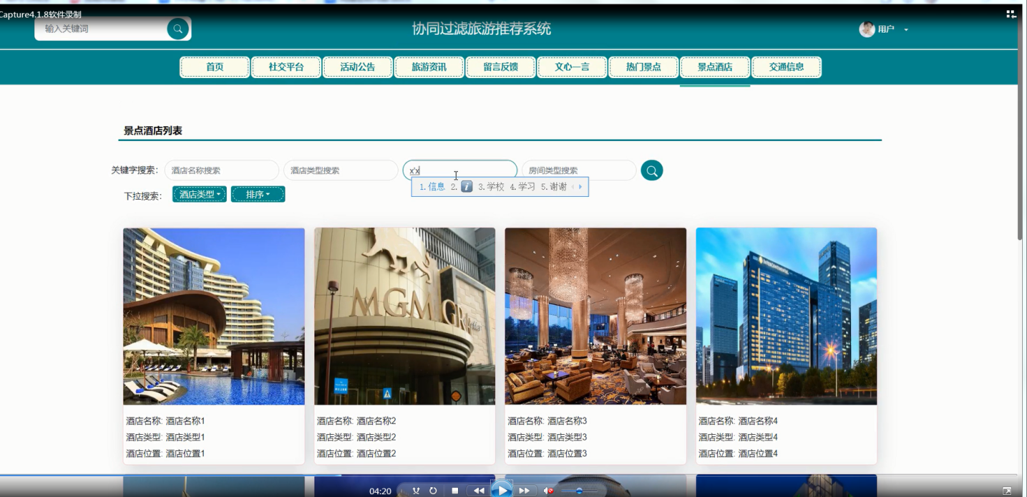 协同过滤作为一种常用的推荐算法,已广泛应用于多个领域,如电子商务、社交网络及内容推荐等。在旅游推荐系统中,协同过滤算法通过分析用户之间的相似性,能够为用户提供基于其他相似用户行为的推荐内容。用户行为的分析是协同过滤算法的基础,通过对用户的浏览、购买、评价等行为进行深入挖掘,可以发现用户潜在的兴趣点,从而为其提供更加符合需求的旅游景点、酒店和其他相关服务。随着推荐技术的不断发展,旅游推荐系统不仅提高了用户体验,还帮助旅游平台提高了转化率和用户粘性。