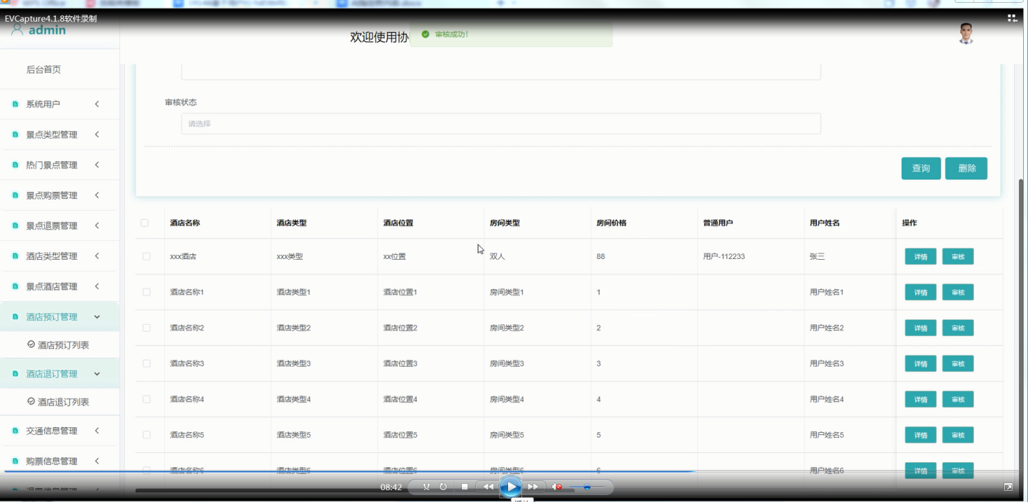 管理员登录后,进入“酒店预订管理”模块。在列表中,可以查看所有酒店预订详情,可以进行查询、删除和审核的操作。酒店预订管理界面如下图所示。
