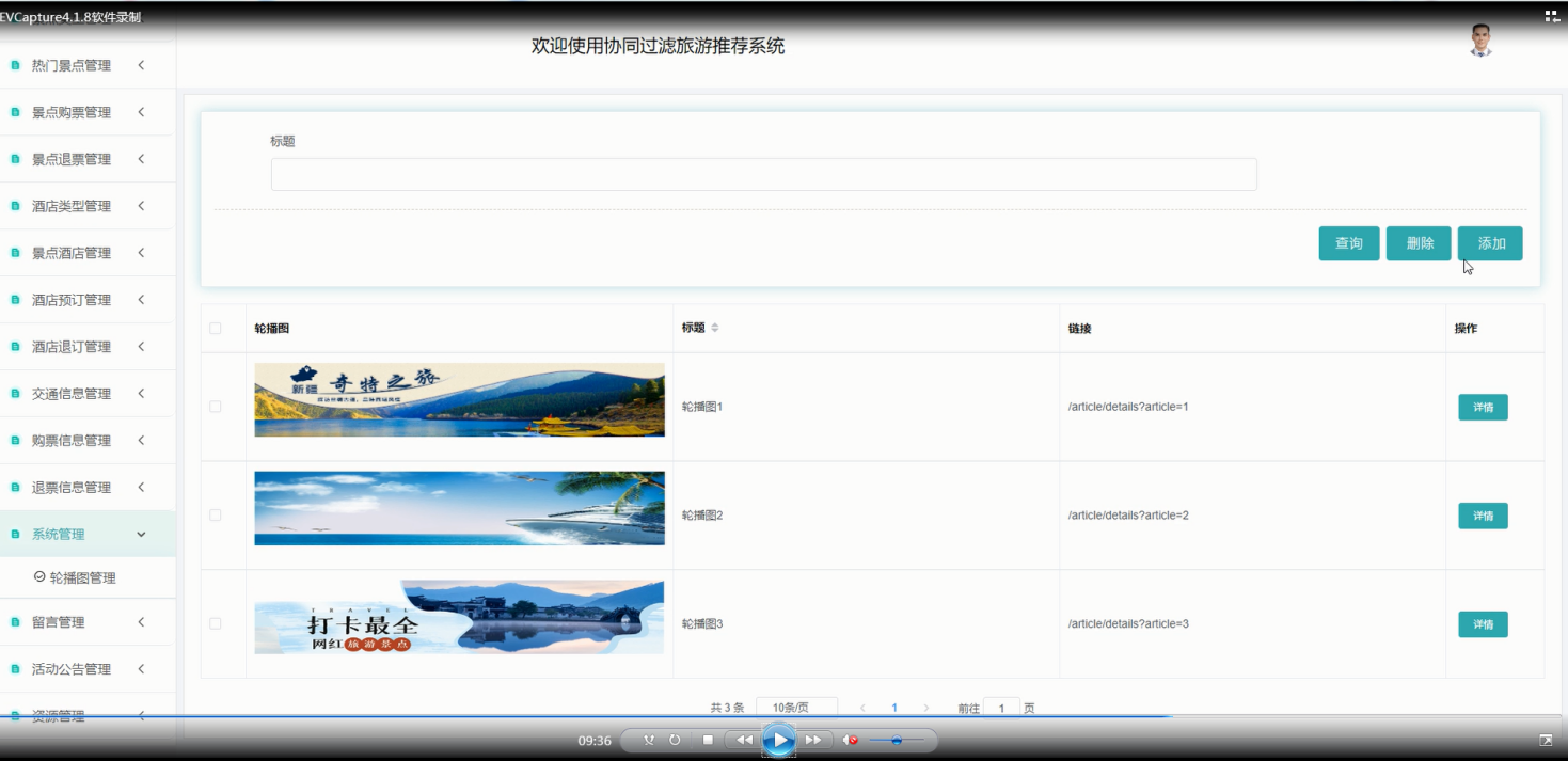 管理员管理网站首页的轮播图内容,确保重要信息得到及时展示。添加、修改、删除轮播图:保证轮播图展示的信息与时俱进。系统管理界面如下图所示。