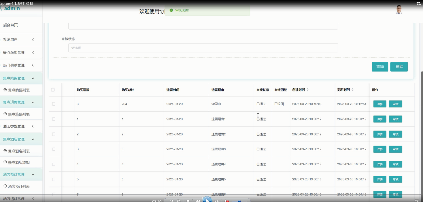 管理员登录后,进入“景点退票管理”模块。在列表中,可以查看所有景点退票详情,可以进行查询、删除和审核退票的操作。景点退票管理界面如下图所示。