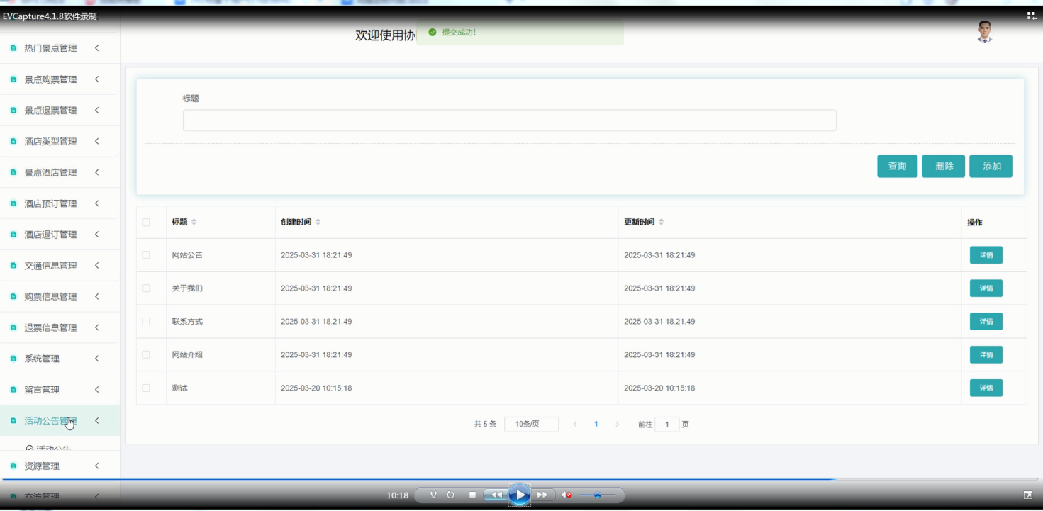 管理员可以发布、修改和删除系统内的通知公告。发布重要信息,确保用户及时获取重要消息。活动公告管理界面如下图所示。