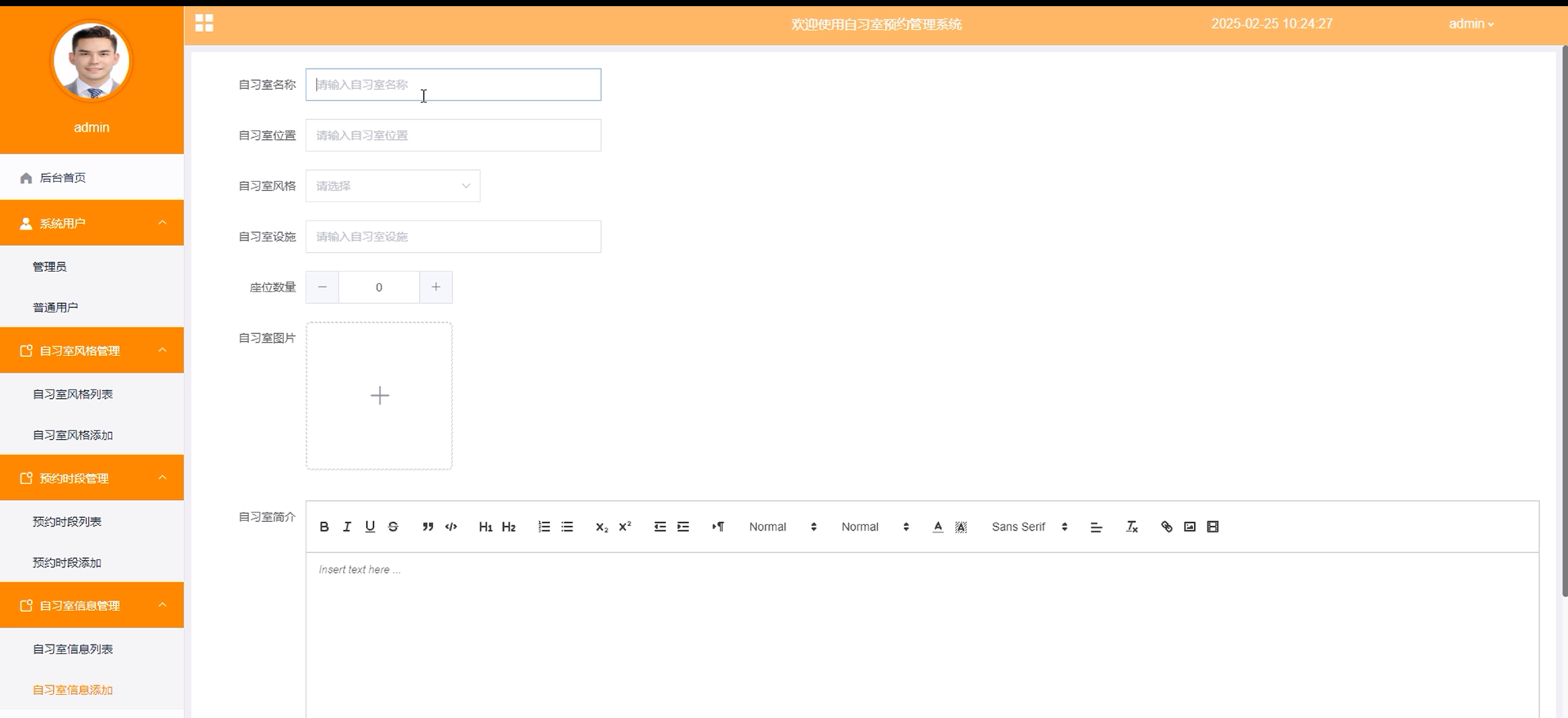 图5-9自习室信息添加界面图