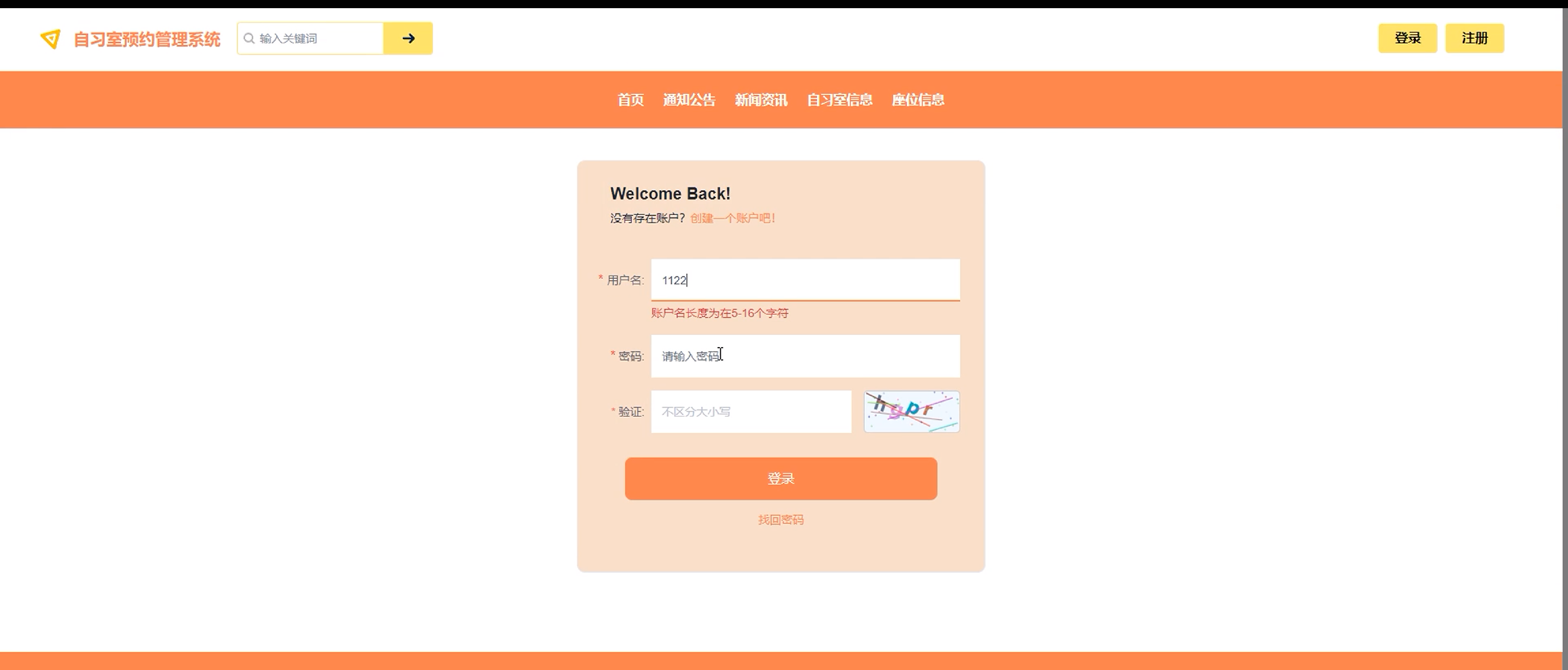 登录:自习室预约管理系统前台注册后的用户是可以通过自己的账户名和密码进行登录的,当用户输入完整的自己的账户名和密码后,点击“登录”按钮后,将会首先验证输入的有没有空数据,再次验证输入的账户名+密码和数据库中当前保存的用户信息是否一致,只有在一致后将会登录成功并自动跳转到自习室预约管理系统的首页中;否则将会提示相应错误信息,用户登录界面如下图所示。