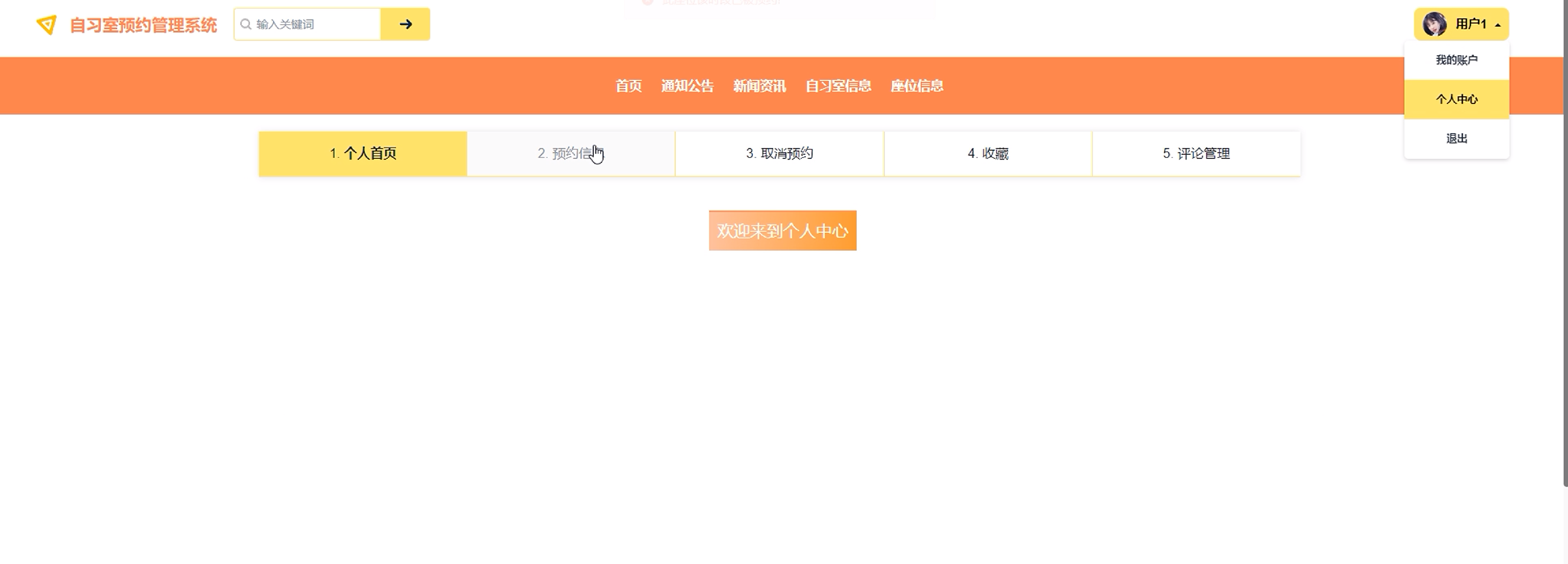个人中心:个人中心包含多个功能模块,如个人首页、预约信息、取消预约、收藏和评论管理。用户点击可查看预约信息,可取消预约信息,可查看历史评论和收藏信息,同时可进行信息删除。界面如下图所示。