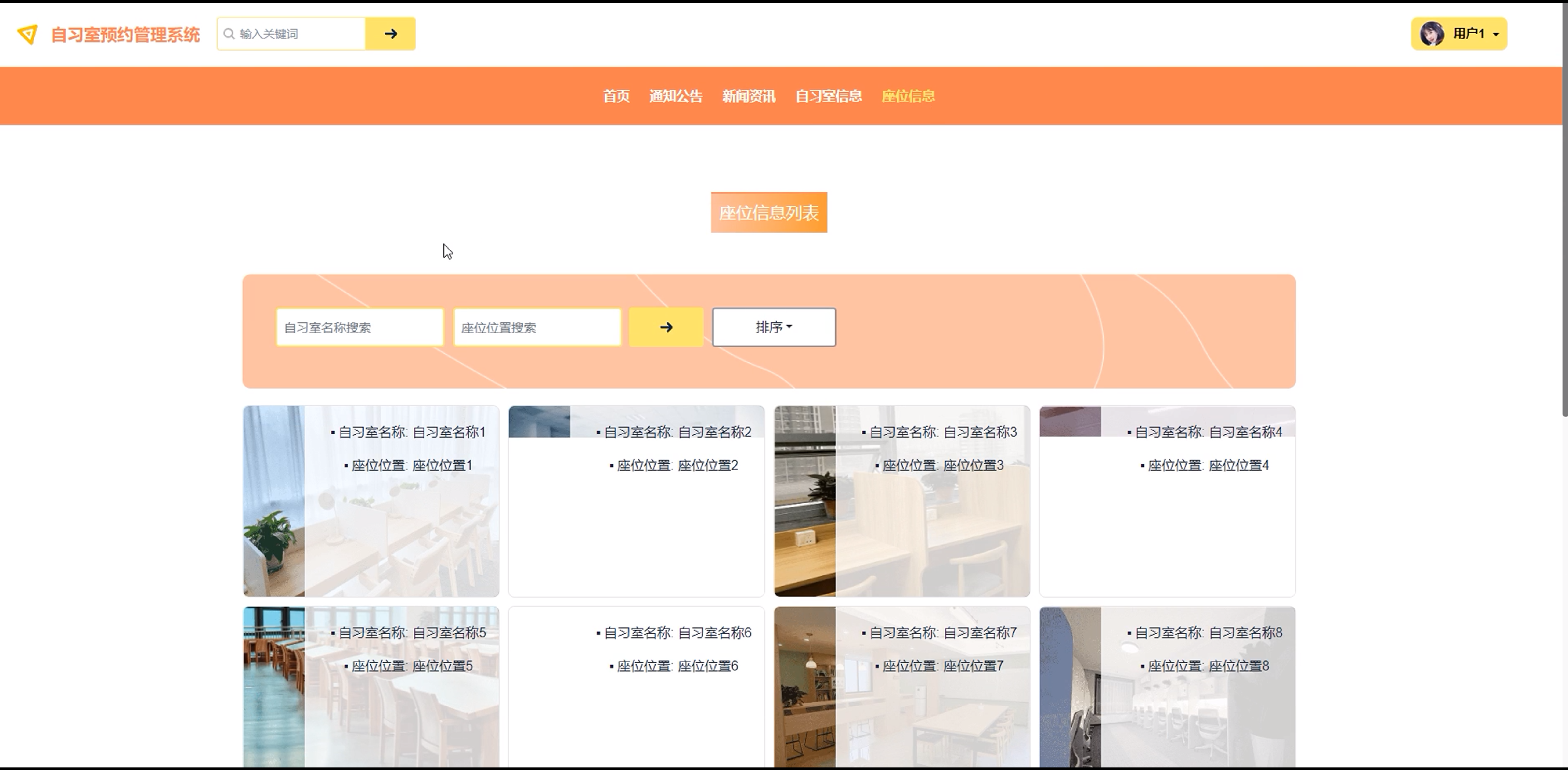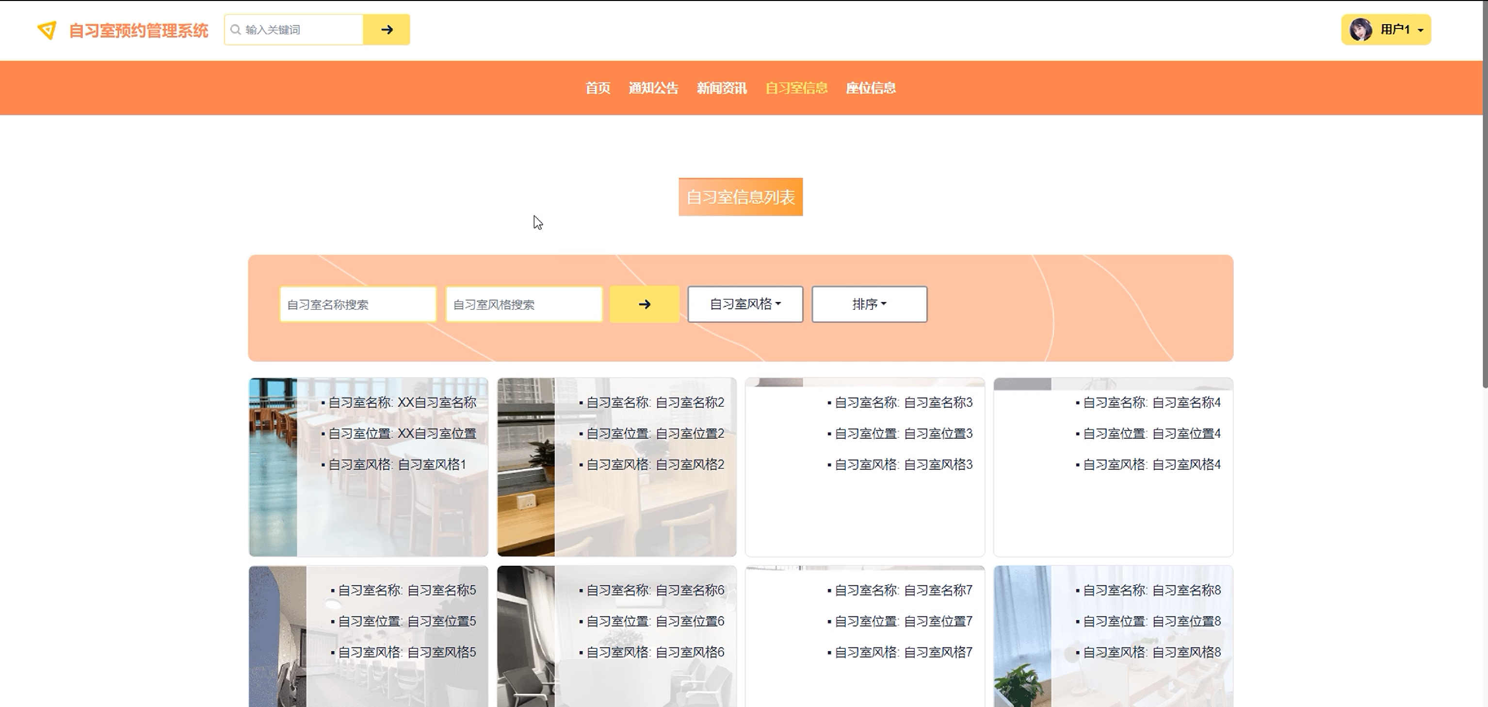 (5)自习室信息:用户点击可通过搜索自习室名称和自习室风格进行查看自习室信息列表,点击进入心仪的自习室可查看详情信息,可对自习室信息进行点赞、收藏和评论。