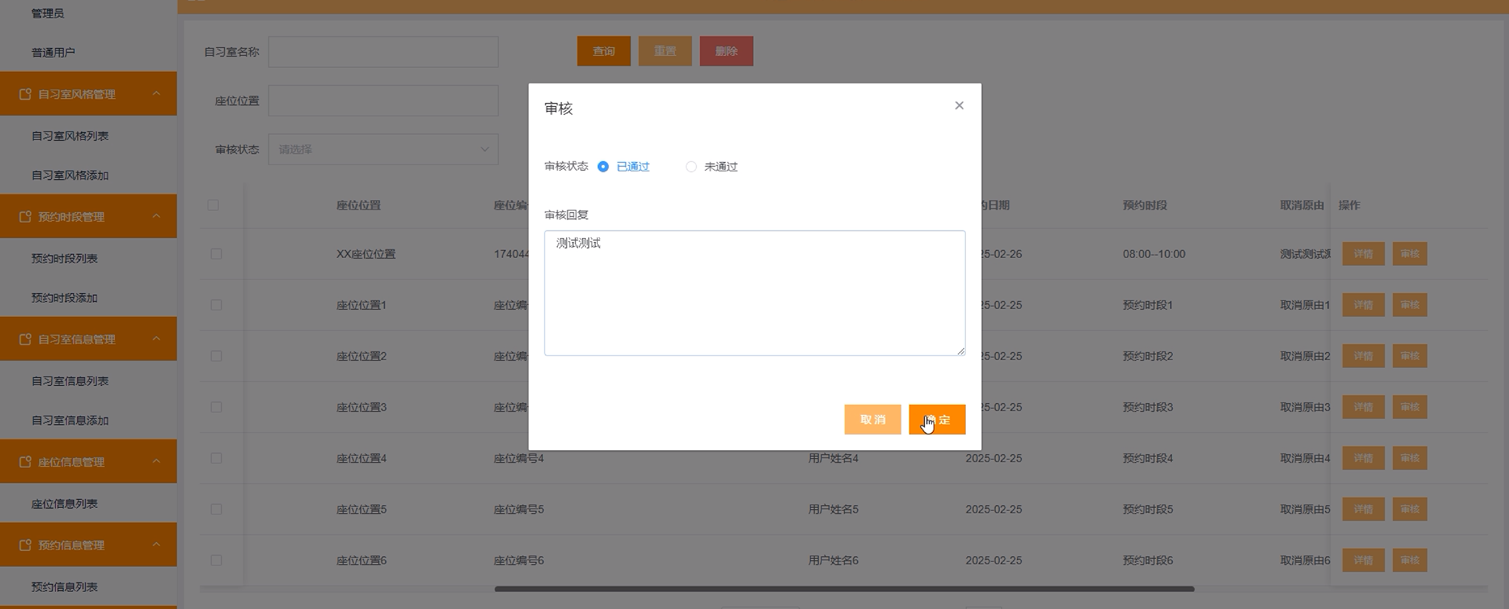 (9)取消预约管理:管理员点击可查看取消预约列表,同时可对用户的取消预约进行审核回复。