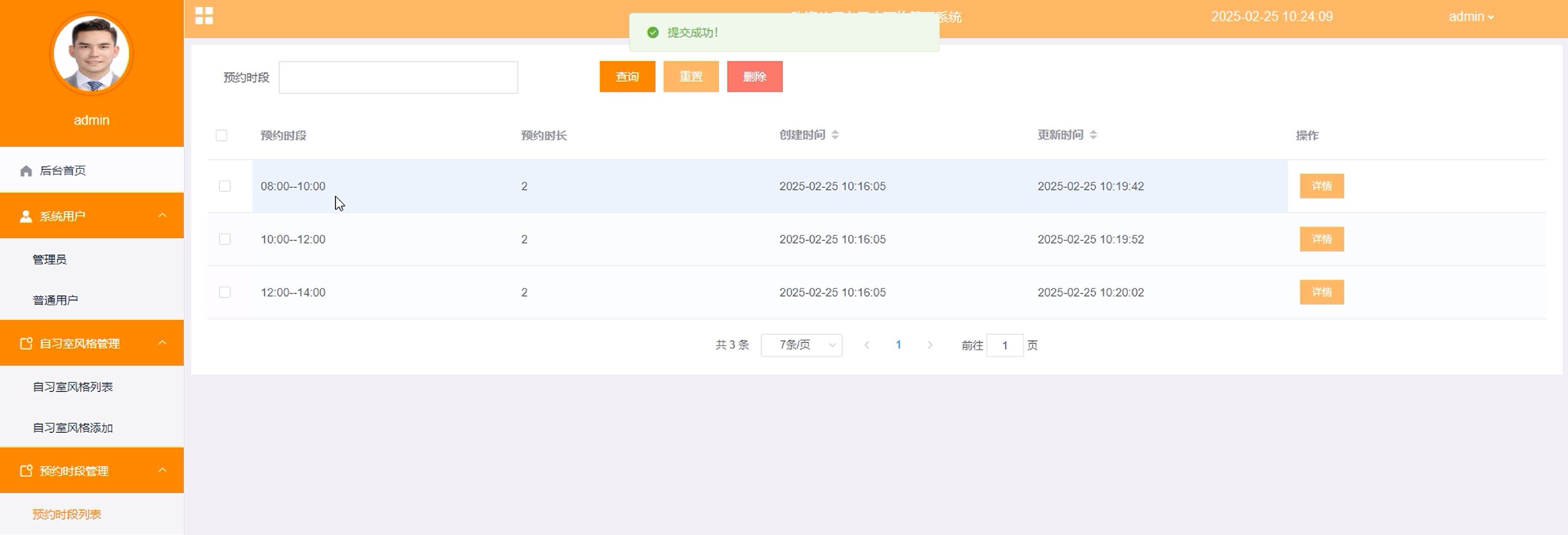 (5)预约时段管理:管理员点击可查看预约时段列表,同时可对预约时段进行增删改查。