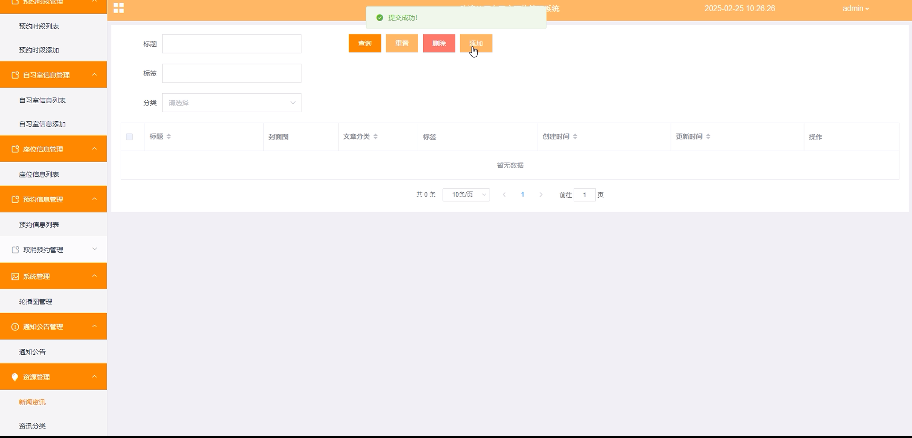 资源管理:管理员点击可查看新闻乐资讯和资讯分类;如需添加新的资讯,点击“添加”按钮,上传封面图,输入标题,选择分类,输入标签、描述和和正文,点击“确认”按钮进行添加。同时可对资讯和分类行增删改查。界面如下图所示。