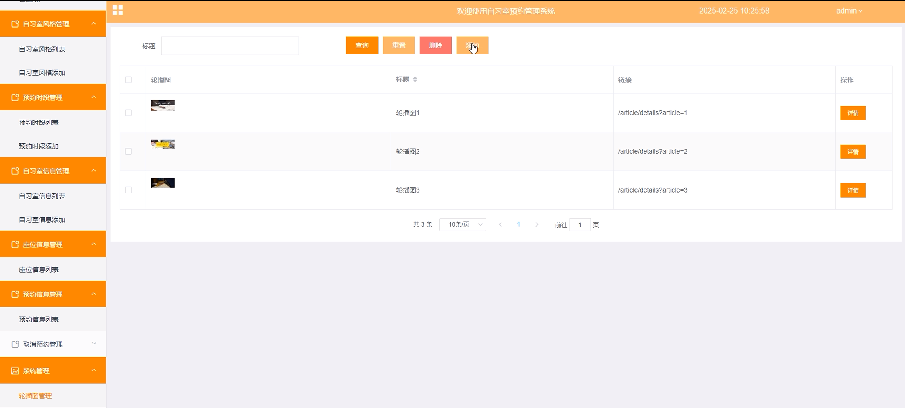 (10)系统管理:管理员点击可查看轮播图管理;如需添加新的轮播图,点击右侧“添加”按钮,上传图片,输入标题和链接,点击“确认”按钮进行添加,可对轮播图进行增删改查。
