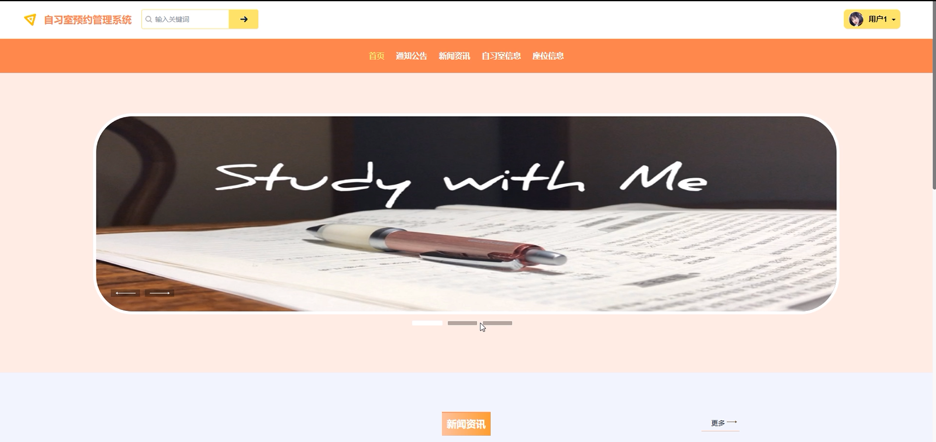(2)首页:用户进入自习室预约管理系统的时候,首先映入眼帘的是系统的首页、通知公告、新闻资讯、自习室信息、座位信息等信息。