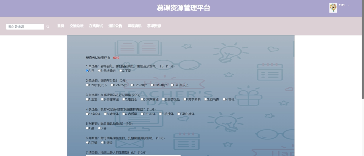在线测试:在线测试模块为用户提供了自主学习和评估的机会。用户可以选择参与在线测试,检验自己对课程内容的掌握情况。平台支持根据不同的学科设置相应的测试题库,并自动评分,帮助用户了解自己的学习进度。