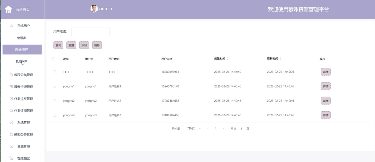 系统用户管理:管理员可以管理所有平台用户的基本信息,包括普通用户和教师用户。管理员能够对用户进行权限设置和管理,确保平台的正常运行和数据的安全性。