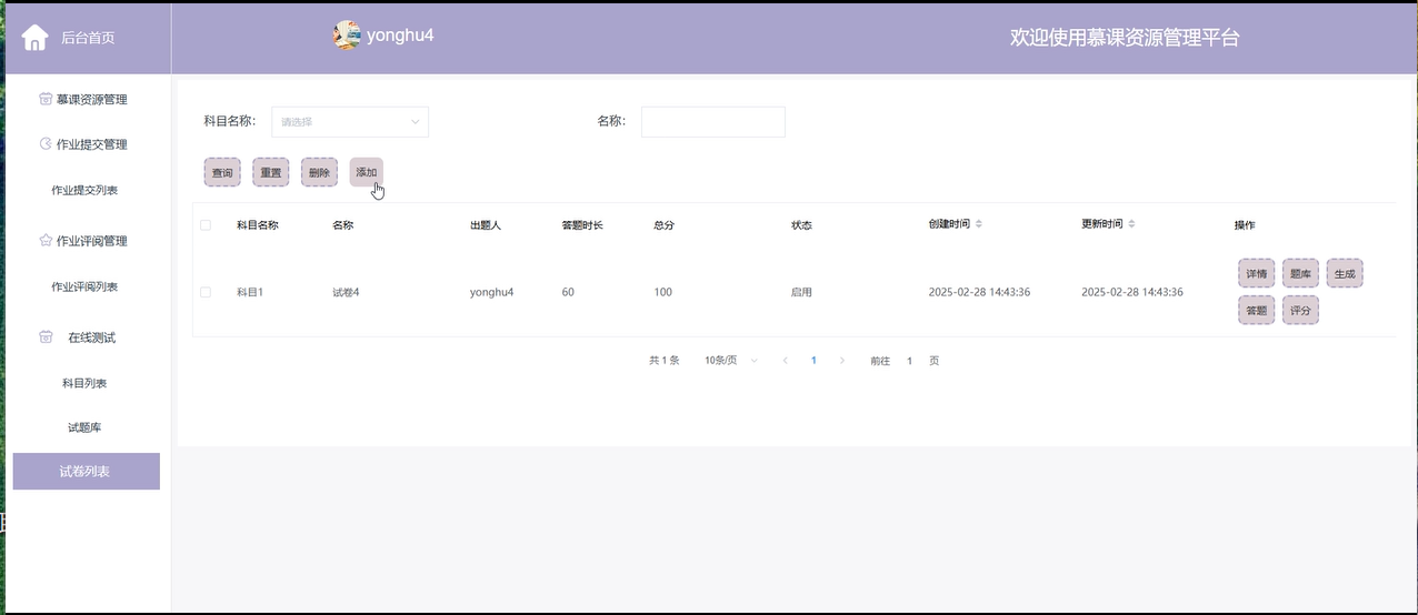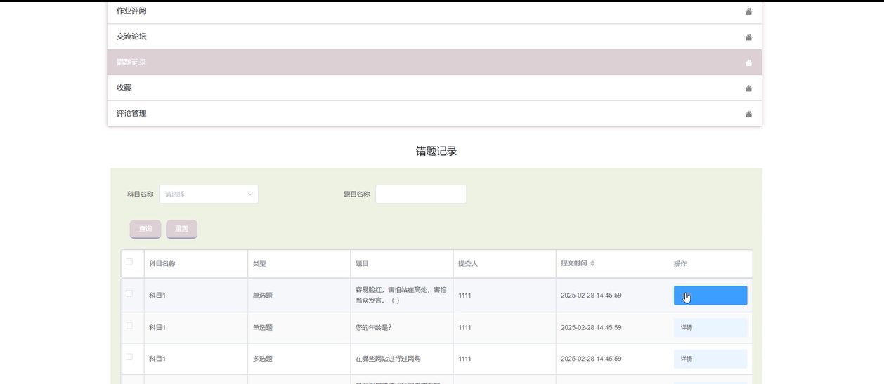 在线测评管理:管理员可以设置和管理在线测评的相关内容,包括科目列表、试题库、错题记录、试卷列表等,帮助平台管理员维护系统的教学质量。