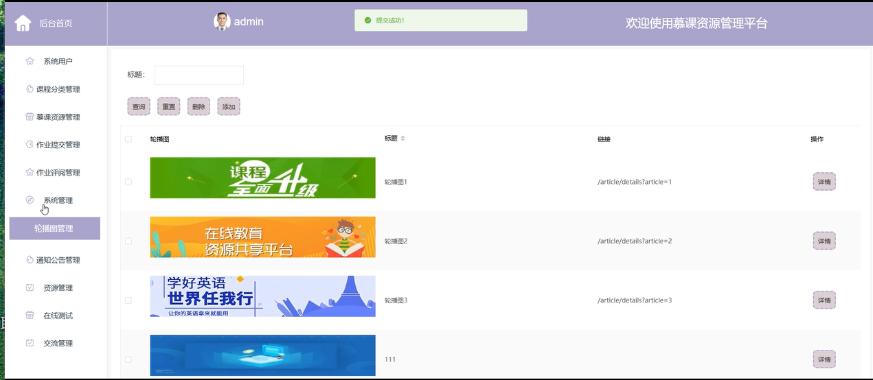轮播图管理:管理员可以在平台首页管理轮播图的内容,展示平台的最新活动、课程推荐、通知公告等信息,以吸引用户关注。