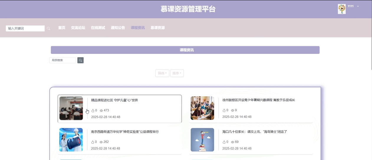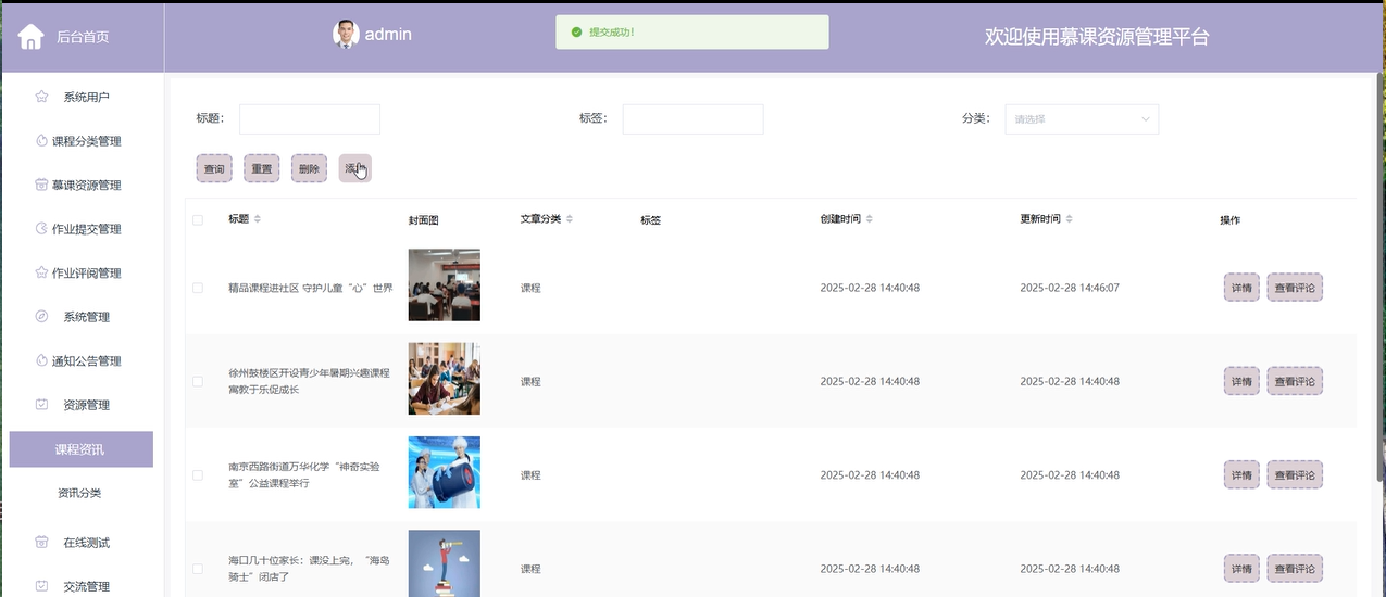 资源管理:管理员可以管理平台上的各种资源,如课程资讯、新闻分类等,确保平台上的内容准确、及时且有序。