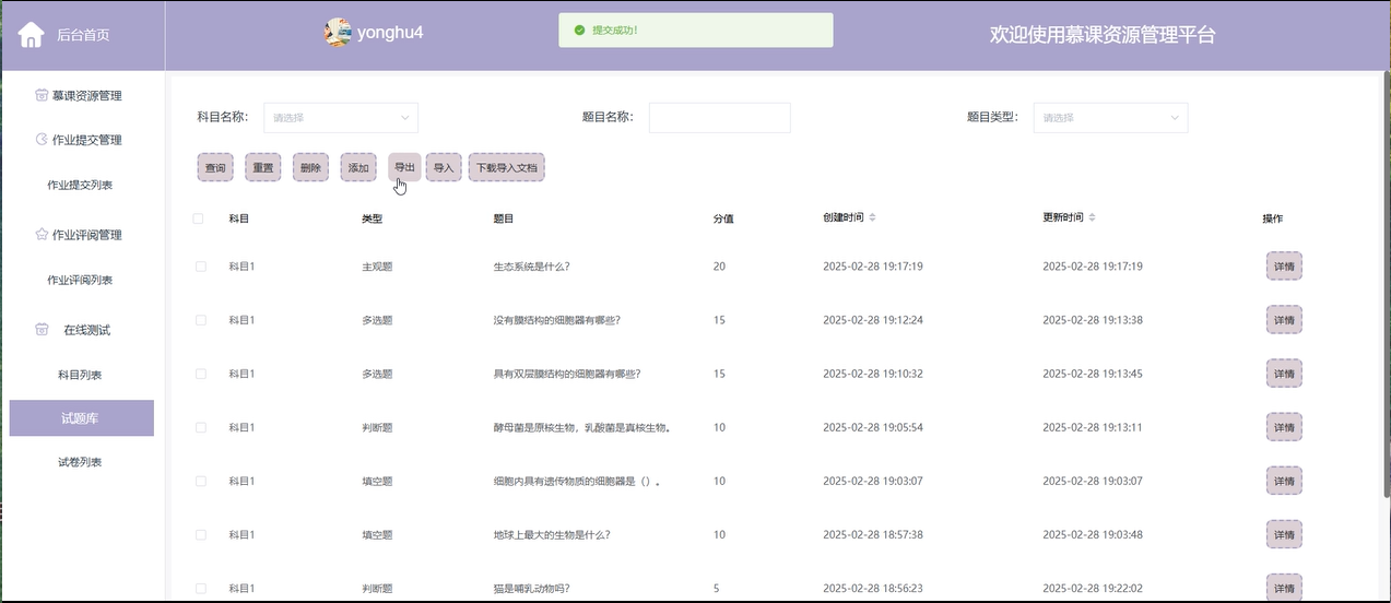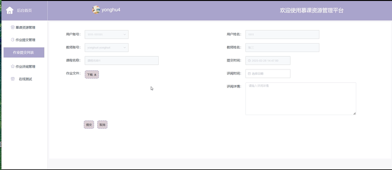 作业提交管理:管理员能够查看和管理平台上所有作业的提交情况,包括作业提交的时间、提交者、作业内容等,确保作业提交流程的顺利进行。