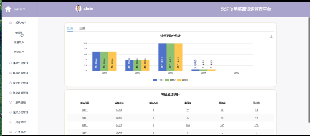 作业评阅管理:管理员可以查看作业评分情况。
