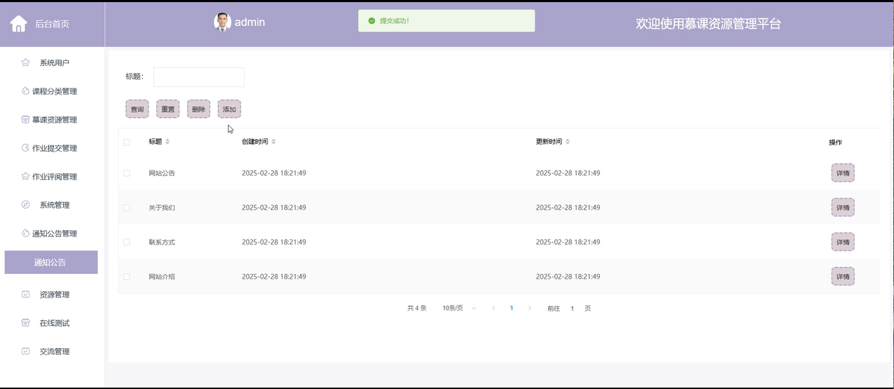 通知公告管理:管理员可以发布和管理平台上的通知公告,包括平台更新、课程更新、活动安排等信息,确保用户能够及时获得重要信息。