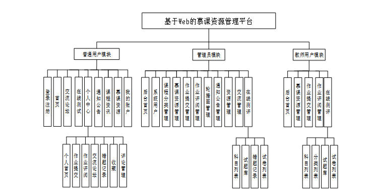 对于普通用户,平台提供了在线注册与登录功能,方便用户获取个性化的学习资源。同时,用户可以通过课程资讯、在线测试、交流论坛、慕课资源等功能进行学习与互动。此外,个人中心为用户提供了作业提交、评阅、错题记录、评论管理等多项功能,提升了用户的学习体验。教师用户能够管理慕课资源、作业提交与评阅,通过在线测评模块进行课程评估和反馈,确保教学内容的质量与效果。管理员则负责后台管理,包括用户信息、课程资源、作业管理、系统设置等操作,以确保平台的正常运行与信息的安全。