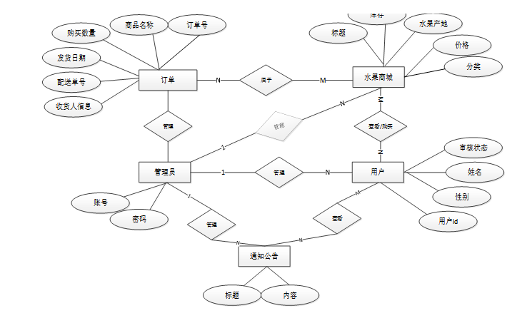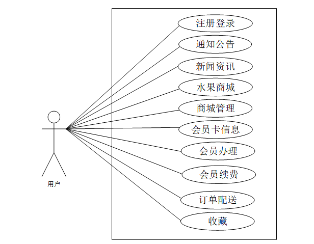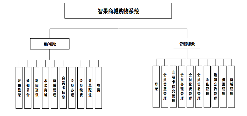 - 商城管理:分为水果商场中的产品上架下架、分类列表、订单处理、订单配送安排、会员等级设置、处理订单售后等。