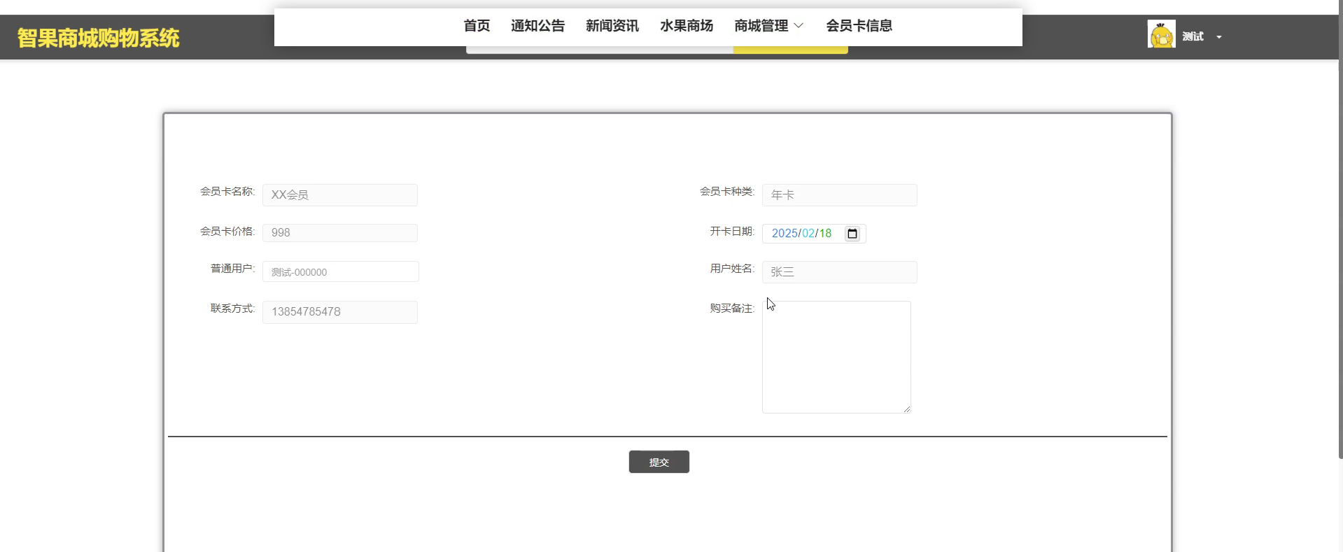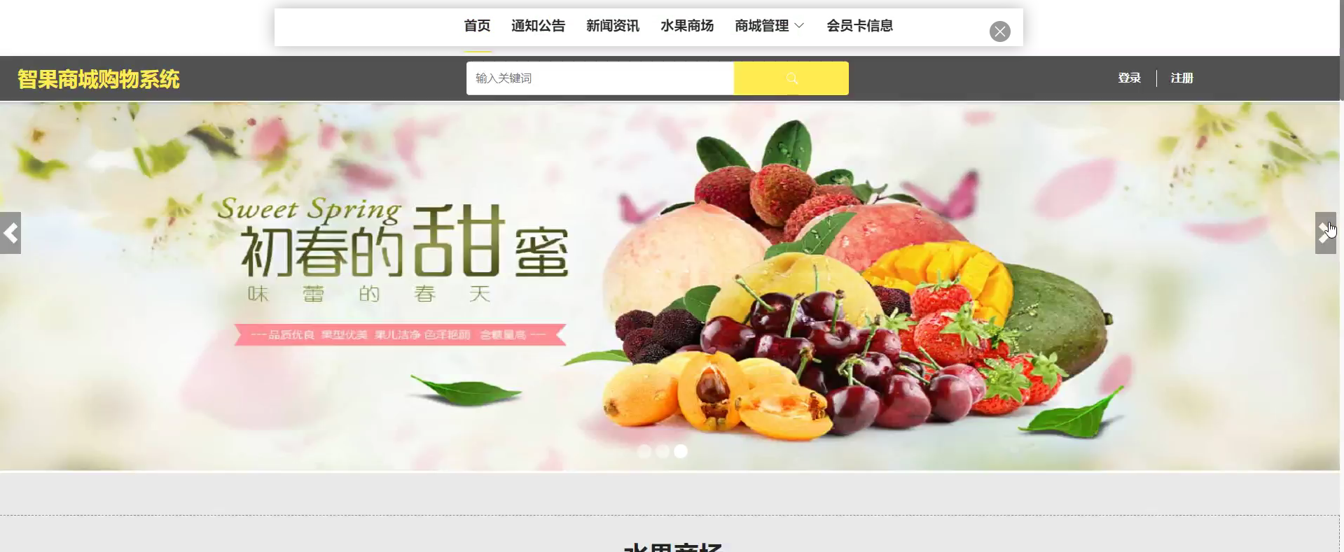 前端首页模块主要实现的是对系统首页的展示。首页设计简洁明了,包含了通知公告、新闻资讯、水果商场、商城管理、会员卡信息等模块,方便用户快速找到所需信息。页面布局合理,色彩搭配和谐,能够提供良好的用户体验。此外,首页还设置了搜索框,方便用户通过关键词快速搜索所需产品。前台首页模块展示如下图所示。