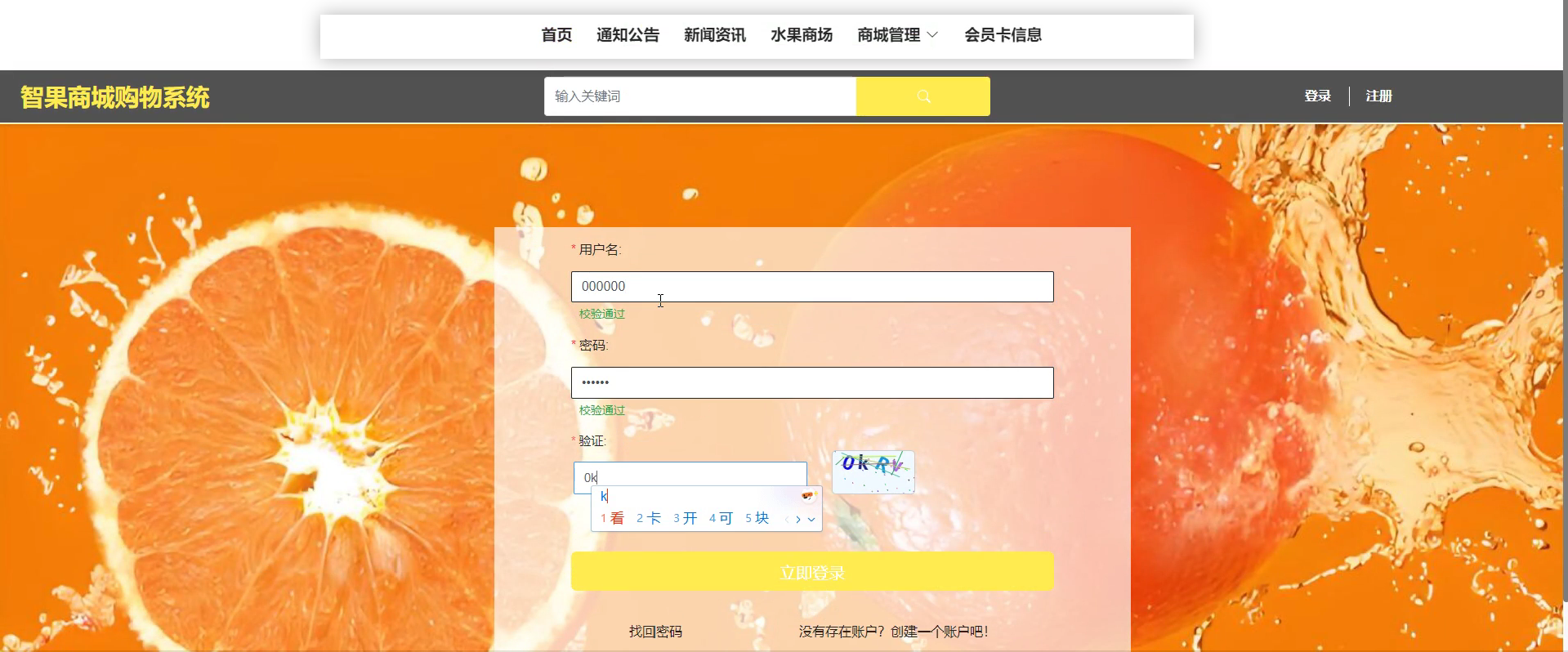 智果商城购物系统中的前台上注册后的用户是可以通过自己的用户名+密码进行登录的,当用户输入完整的自己的用户名+密码信息并点击“登录”按钮后,将会首先验证输入的有没有空数据,再次验证输入的用户名+密码和数据库中当前保存的用户信息是否一致,只有在一致后将会登录成功并自动跳转到智果商城购物系统的首页中;否则将会提示相应错误信息。登录模块展示如下图所示。