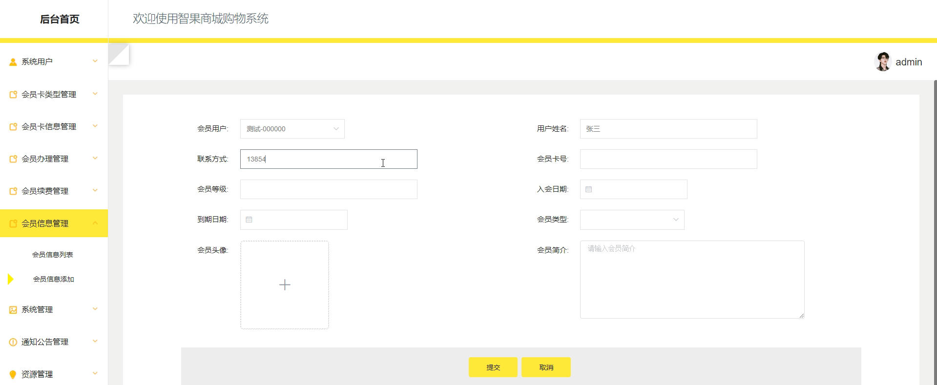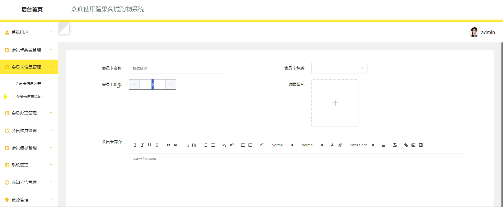 在智果商城购物系统中,管理员可以通过点击会卡员信息管理来执行对所有会员卡的增删改查操作。管理员能够便捷地添加新的会员卡信息,对于需要更新或删除的信息,管理员可以直接定位到特定会员卡进行修改或移除操作,确保数据的准确性和时效性。会员卡信息管理模块展示如下图所示。