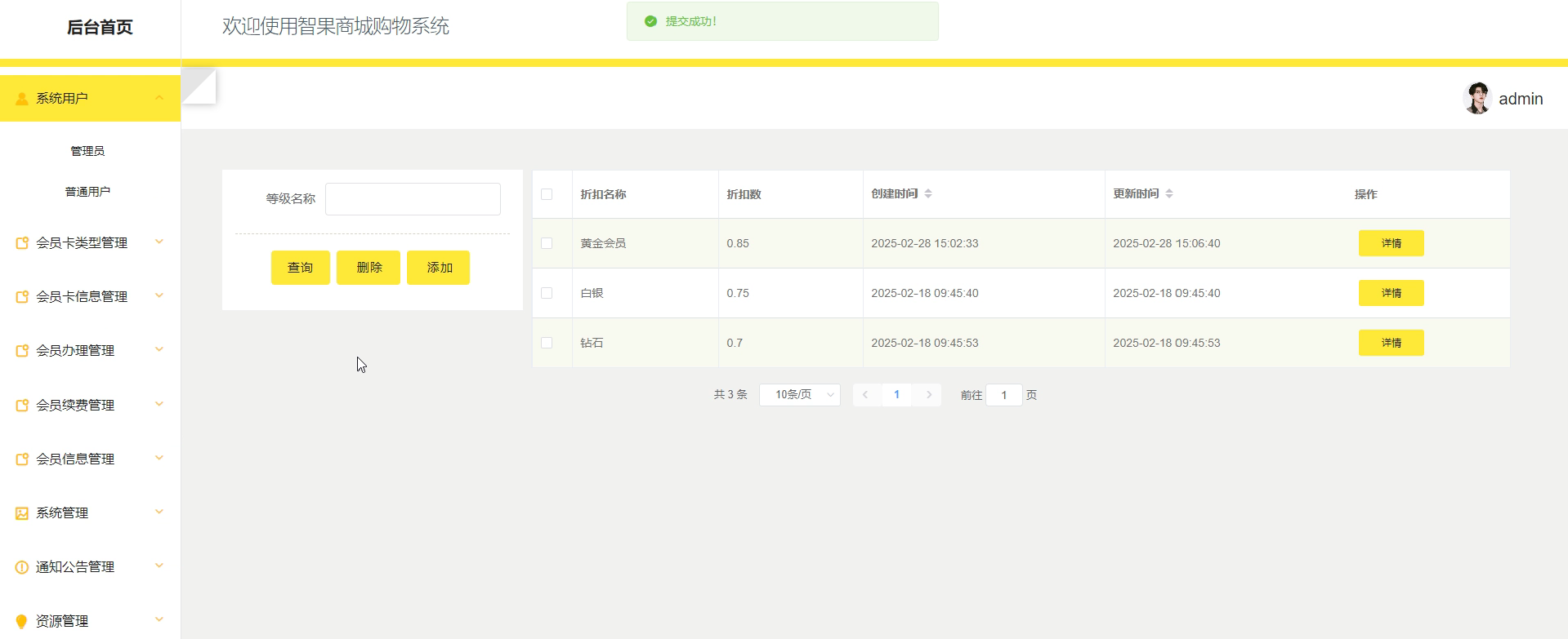 在智果商城购物系统中,管理员可以通过点击系统用户管理功能对所有会员等级权限进行设置与管理。进入会员管理界面后,管理员能够查看现有的会员等级,并对每一等级的权益和优惠进行调整。通过这一功能,管理员可以有效管理和优化会员体系,系统用户模块展示如下图所示。