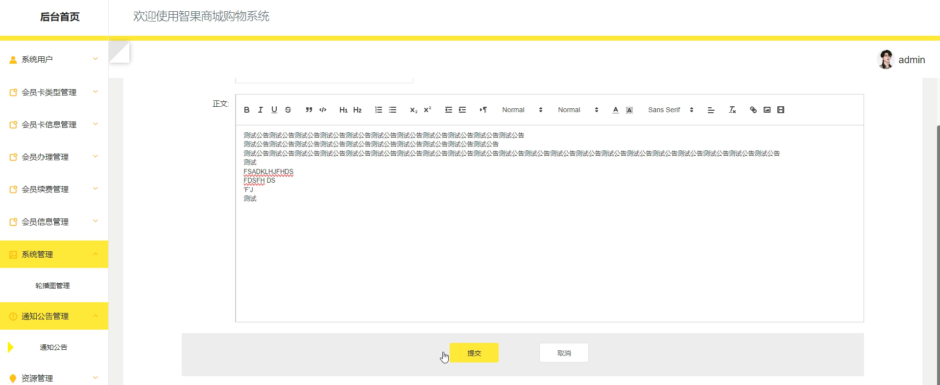 在智果商城购物系统中,管理员可以通过点击通知公告界面轻松发布新的功能内容。进入通知公告管理页面后,管理员可以撰写新公告,详细描述新功能的信息及其对用户带来的便利。发布公告时,管理员还可以选择重点推送以确保用户能够及时看到重要更新。通知公告管理模块展示如下图所示。