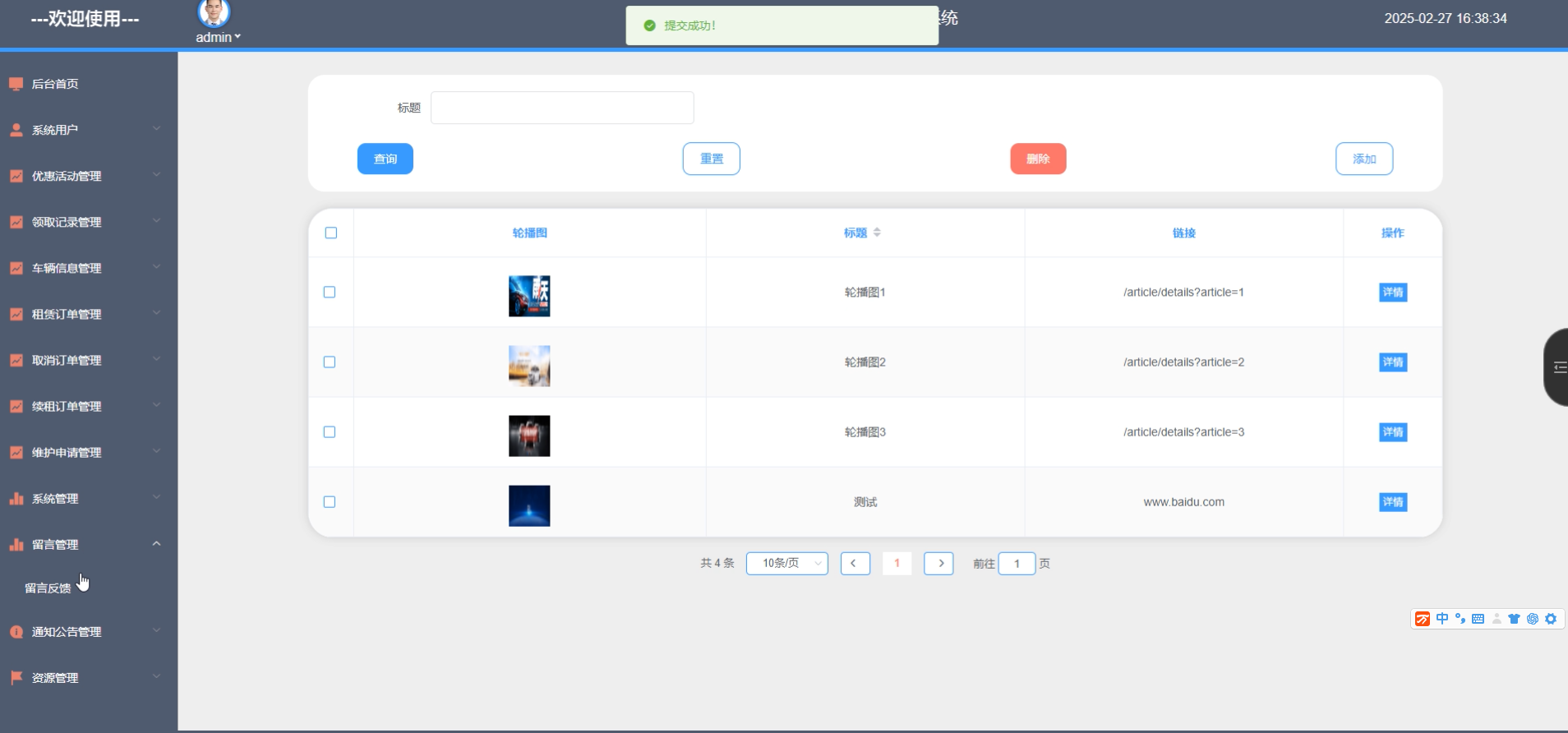 管理员点击“系统管理-轮播图管理”菜单,可以对前台展示的轮播图进行设置,系统管理界面如图5-8所示。