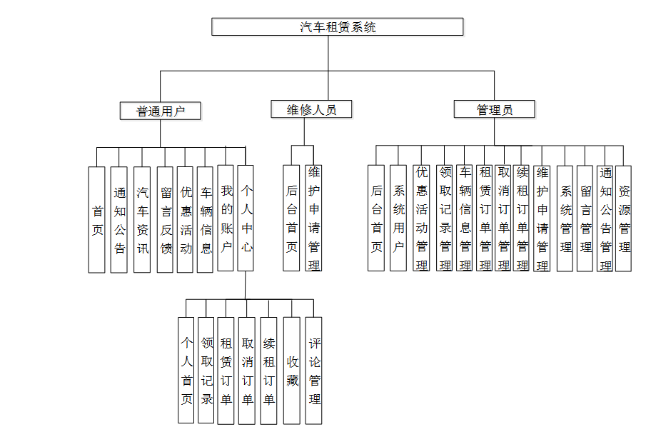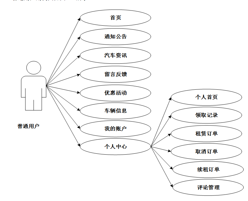 普通用户有首页、通知公告、汽车资讯、留言反馈、优惠活动、车辆信息、我的账户、个人中心(个人首页、领取记录、租赁订单,取消订单、续租订单、收藏 、评论管理)等需求用例。