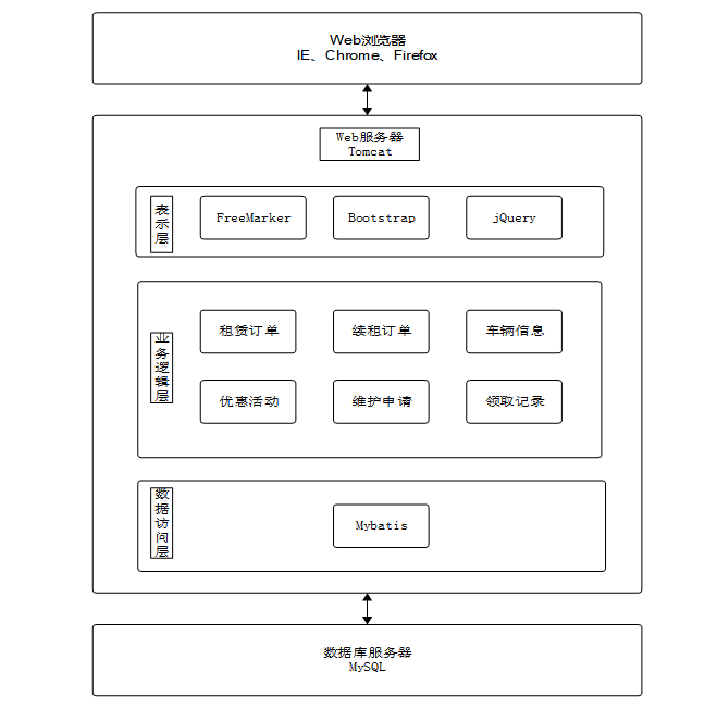 系统由表现层、业务逻辑层、数据访问层和数据库服务器组成。表现层通过浏览器(如IE、Chrome、Firefox)与用户交互,采用FreeMarker、Bootstrap、jQuery等技术实现界面呈现。业务逻辑层负责处理系统的核心业务逻辑,通过分模块设计实现功能分离。数据访问层使用MyBatis框架连接数据库,执行数据的增删改查操作。数据库服务器采用MySQL进行数据存储和管理,为系统提供稳定的数据库支持。整个架构通过Tomcat服务器完成用户请求的接收和处理,确保系统的高效运行[8]。整个系统架构如图4-1所示。