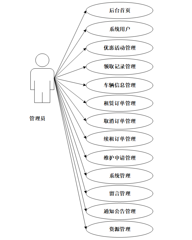 管理员有后台首页、系统用户、优惠活动管理、领取记录管理、车辆信息管理、租赁订单管理、取消订单管理、续租订单管理、维护申请管理、系统管理(轮播图)、留言管理、通知公告管理、资源管理等需求用例。