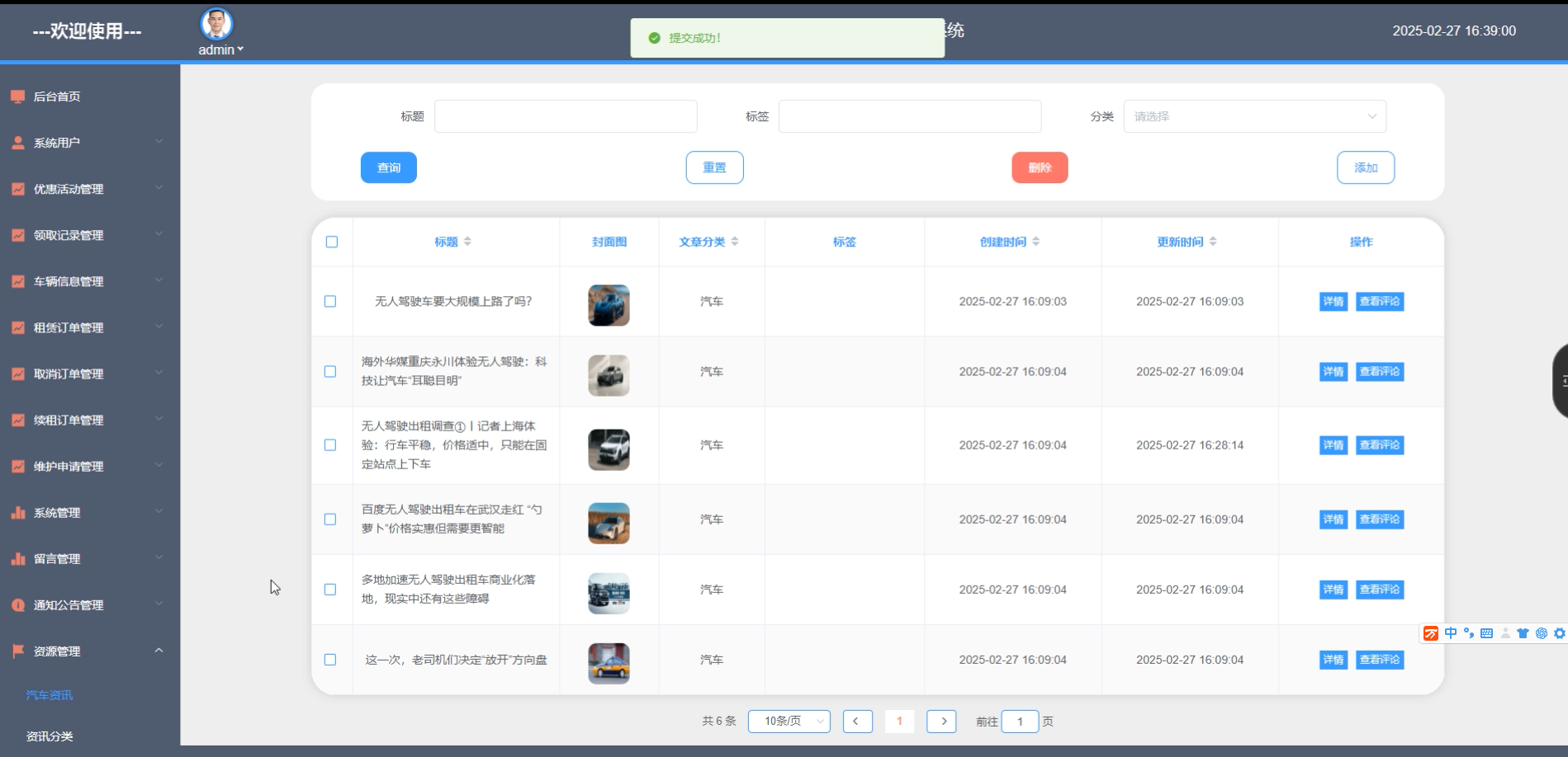 管理员在资讯管理页面查看所有汽车资讯文章,支持新增、编辑和删除操作。点击“新增”填写标题、内容并上传图片,选择分类后发布。可批量删除过期文章。资讯管理界面如图5-10所示。