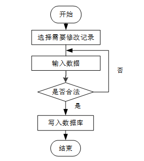 用户首先选择需要修改的记录,输入修改后的数据,系统判断输入数据是否合法。若数据不合法,提示重新输入;若数据合法,则将修改后的数据写入数据库,完成操作后流程结束。修改信息流程图如图3-8所示。