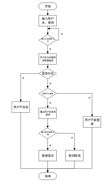 用户输入用户名和密码后,系统先检查输入是否为空,再验证用户名是否存在,若存在则通过用户名获取密码并校验。若密码正确则登录成功,否则提示密码错误。若用户名不存在或无法登录,提示用户操作无效。如图3-5所示。