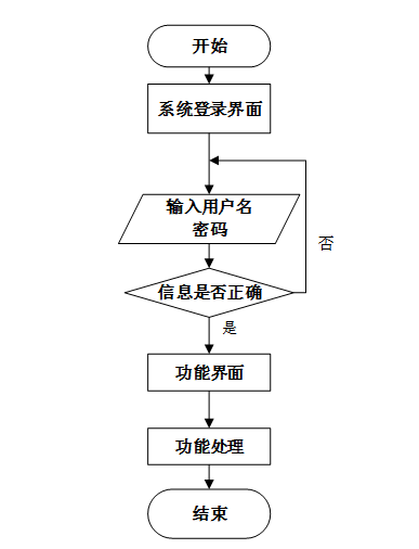 用户首先进入系统登录界面,输入用户名和密码后,系统验证信息是否正确。若验证失败,返回登录界面重新输入;若验证成功,则进入功能界面,执行相应功能处理后结束操作流程。操作流程如图3-6所示。