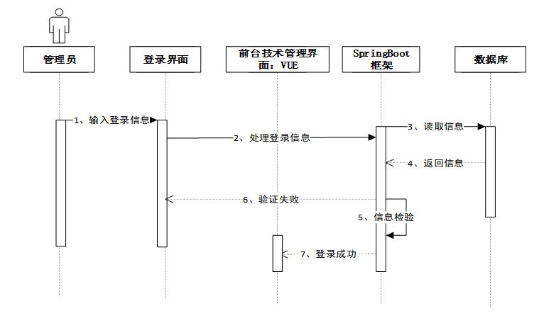 管理员输入登录信息后,登录界面将信息传递至前台管理界面,随后通过SpringBoot框架读取数据库中的用户信息并返回。系统验证信息,若验证成功则登录成功,若验证失败则返回错误提示。登录时序图如图4-4所示。