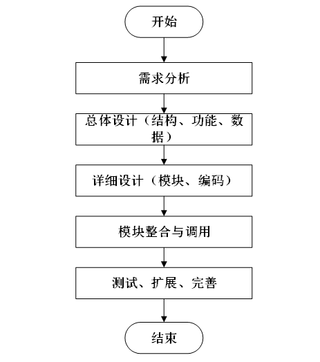 系统开发流程的主要步骤,从需求分析到系统完成的全过程。流程包括需求分析、总体设计(结构、功能、数据)、详细设计(模块、编码)、模块整合与调用,以及测试、扩展和完善,最终完成系统的开发。本系统的开发流程如图3-4所示