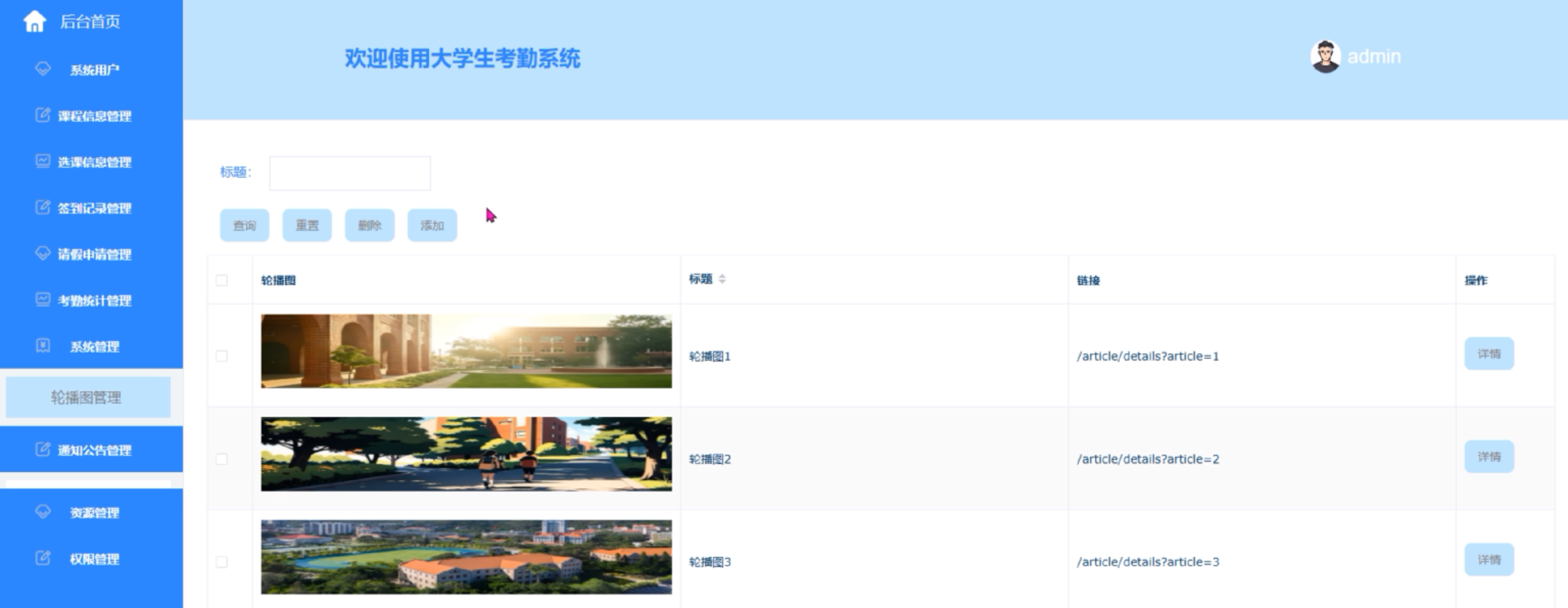 (9)系统管理:管理员点击可查看轮播图管理;如需添加新的轮播图,点击右侧“添加”按钮,上传图片,输入标题和链接,点击“确认””按钮进行添加;同时可对轮播图进行增删改查。