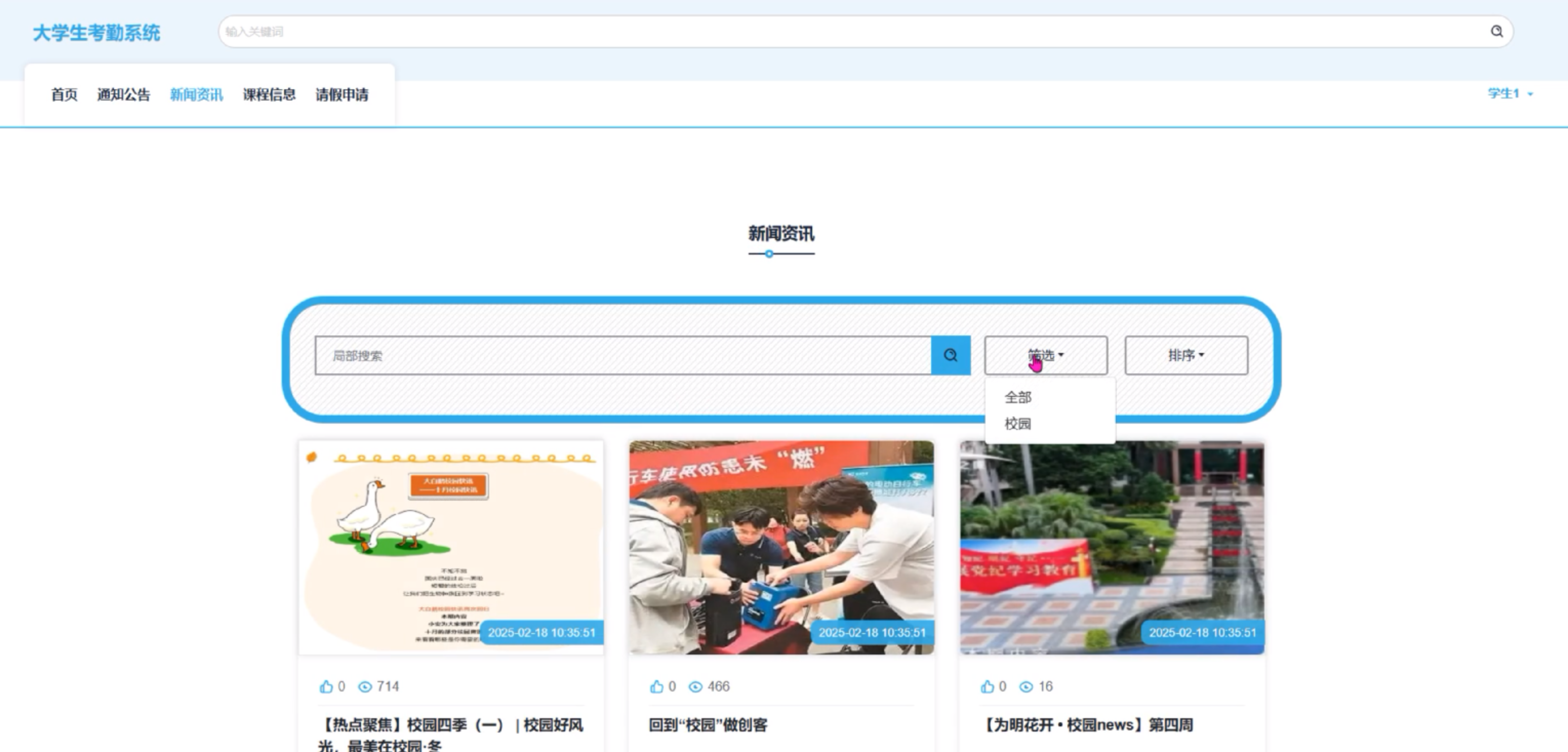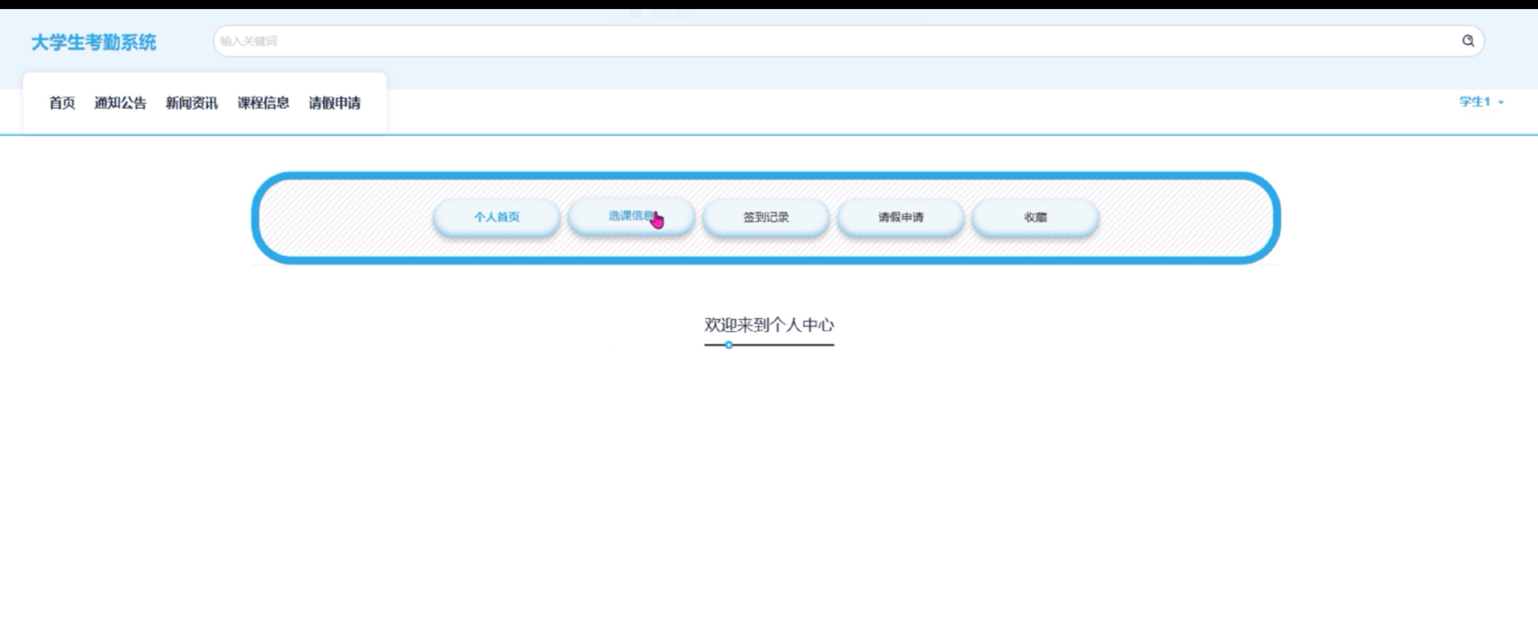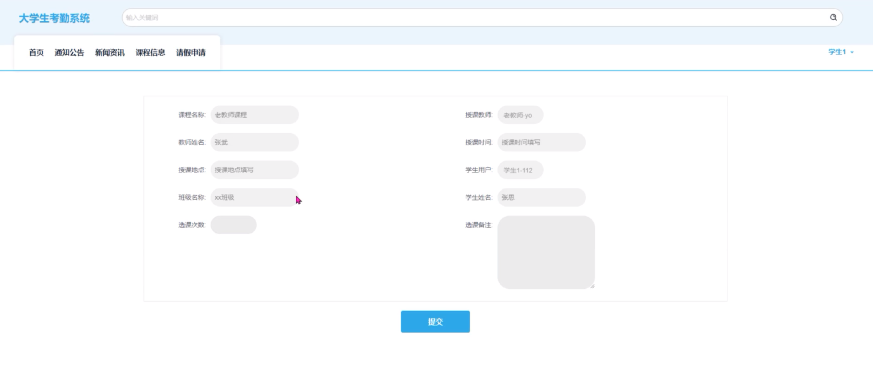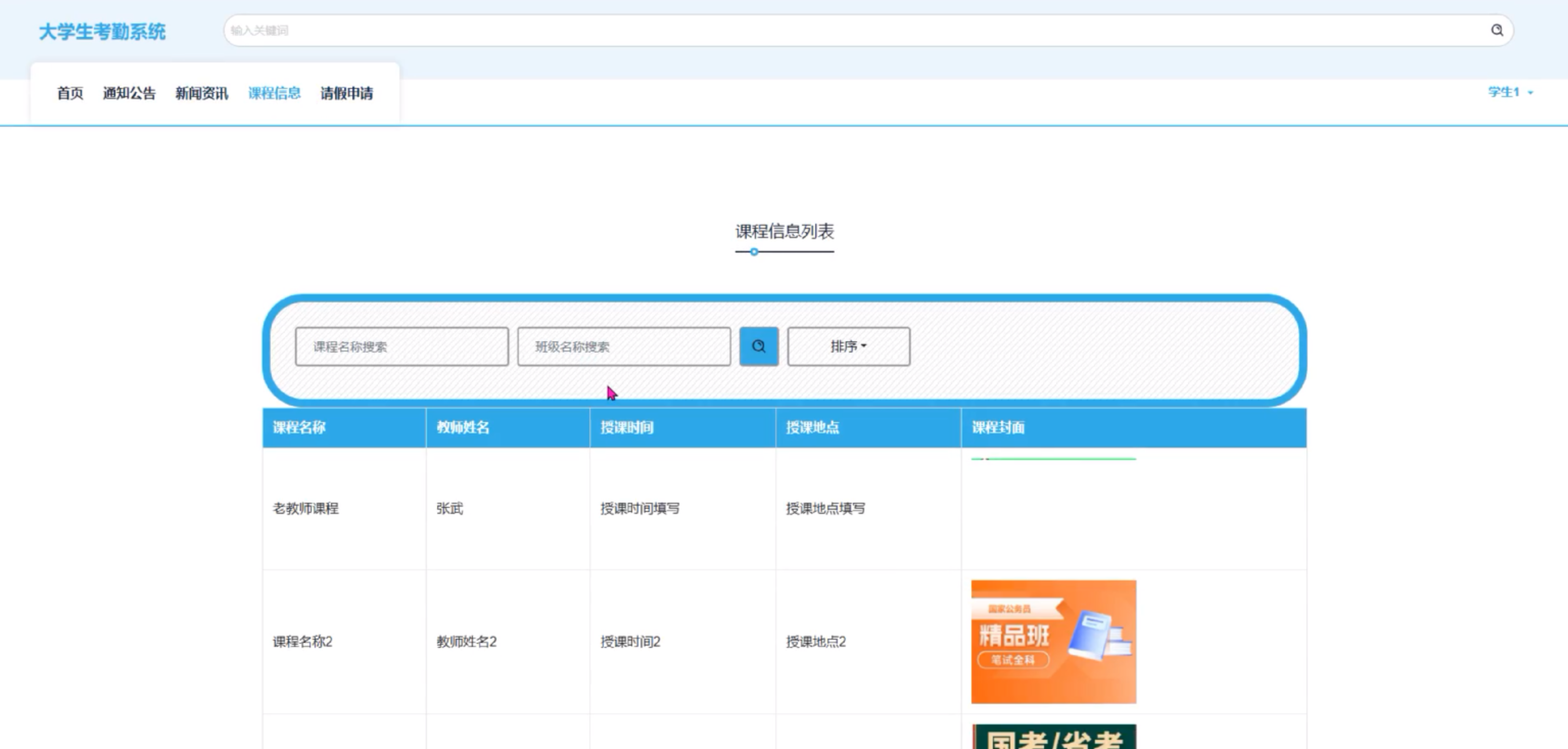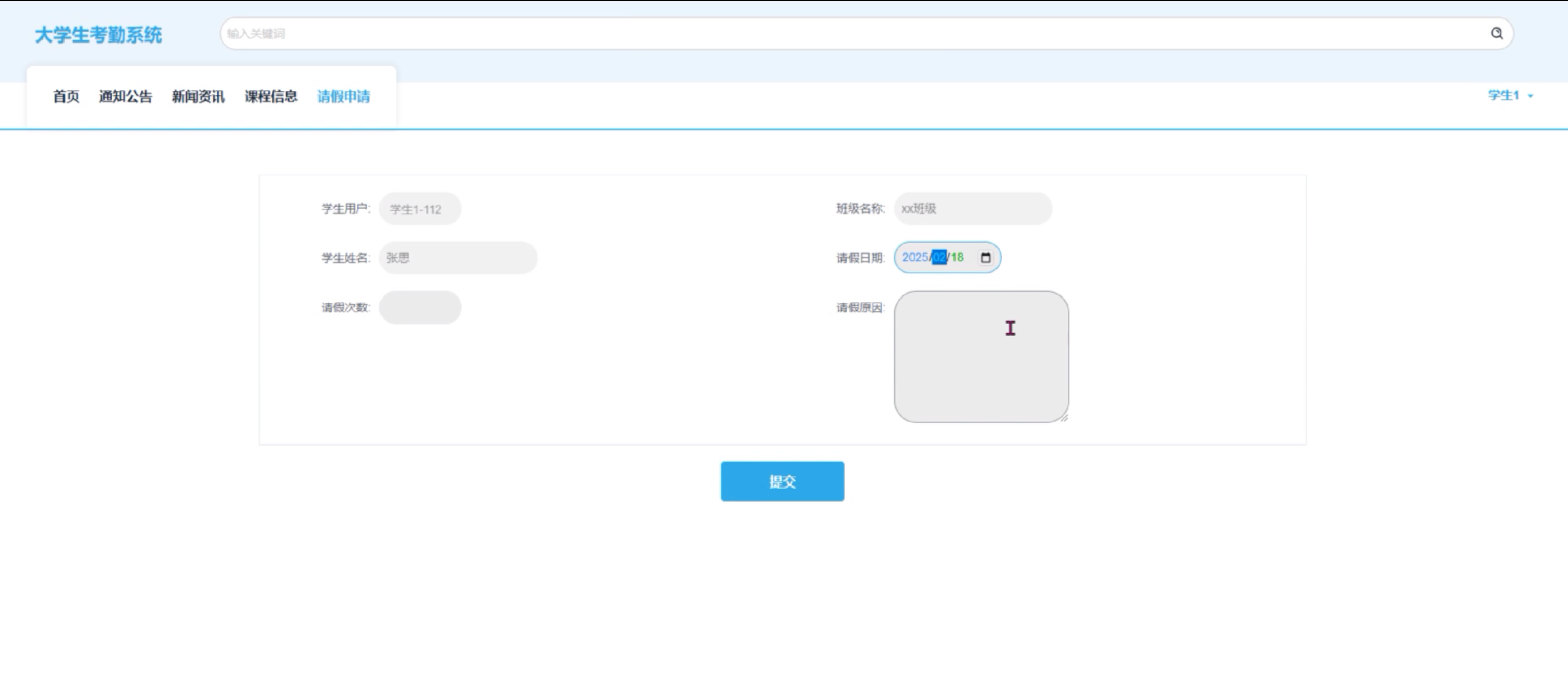 (2)首页:用户进入大学生考勤系统的时候,首先映入眼帘的是系统的首页、通知公告、新闻资讯、课程信息、请假申请等信息。