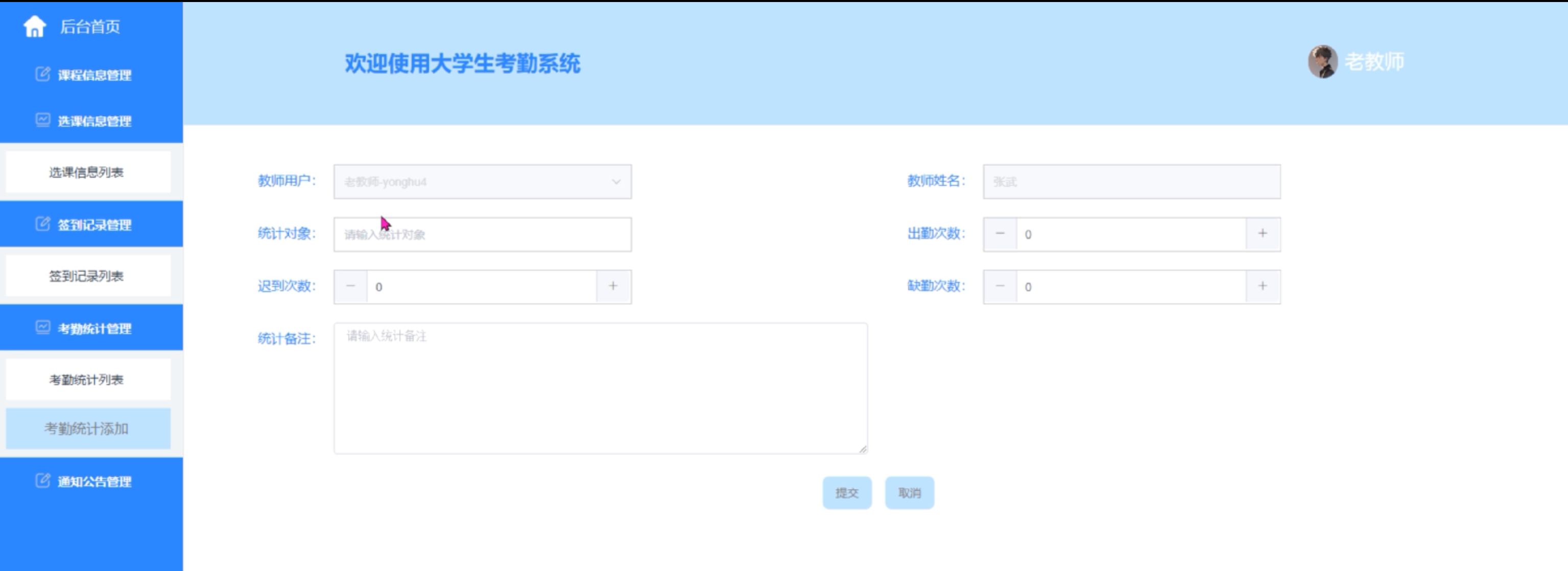 (6)考勤统计管理:教师用户点击可查看考勤统计列表和考勤统计添加;点击进入“考勤统计添加”可填写相关信息,包括教师用户、教师姓名、统计对象、出勤次数、迟到次数、缺勤次数和统计备注。