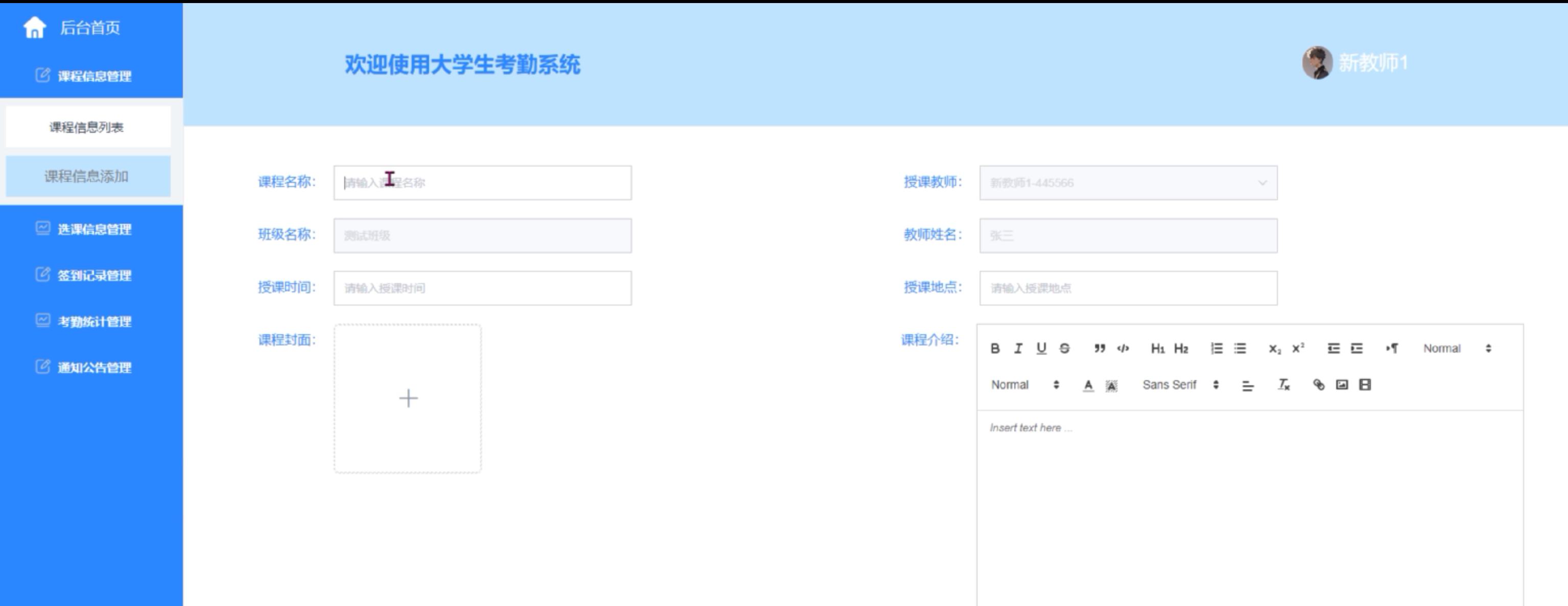 (3)课程信息管理:教师用户点击可查看课程信息列表和课程信息添加;点击进入“课程信息添加”可查看详情信息,包括课程名称、授课教师、班级名称、教师姓名、授课时间、授课地点、课程封面、课程介绍。