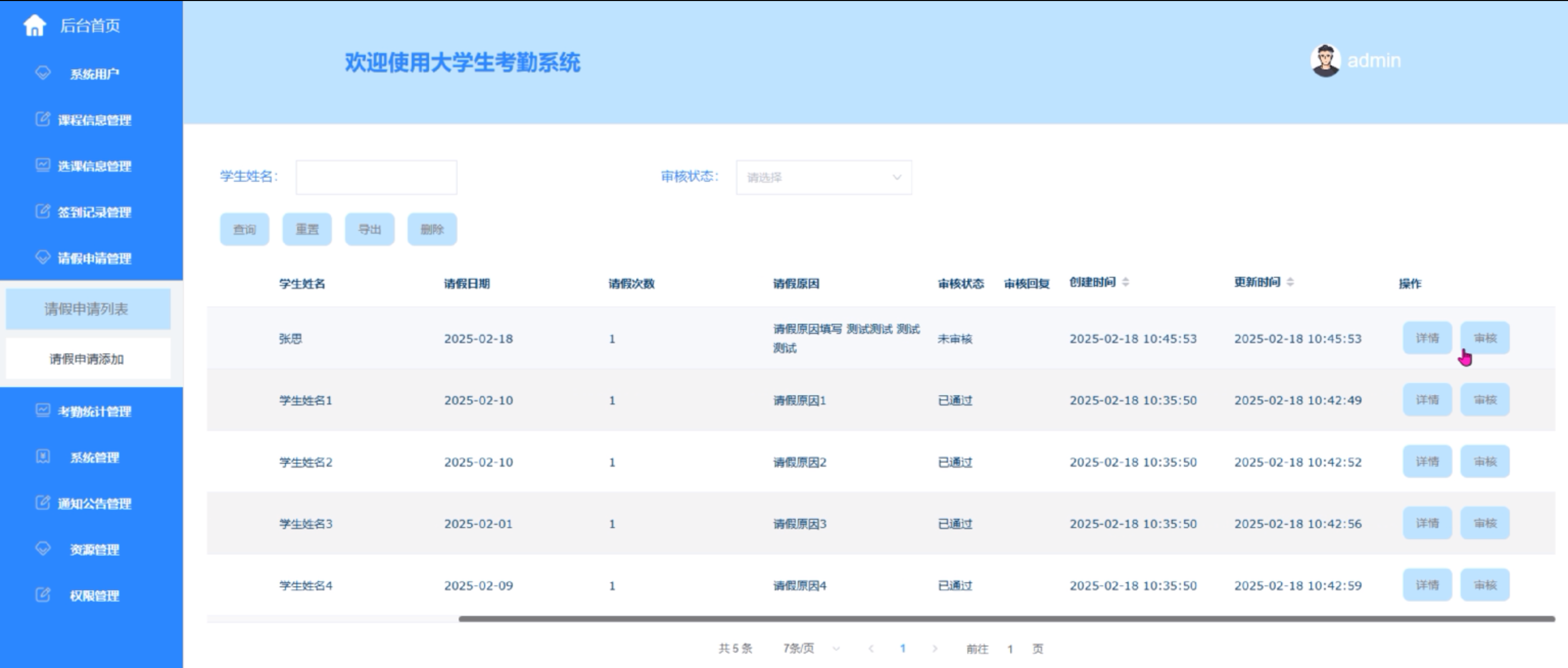 (7)请假申请管理:管理员点击可查看学生用户的请假申请列表,可点击“审核”按钮对请假信息进行审核回复。同时管理员有添加请假信息的权限。