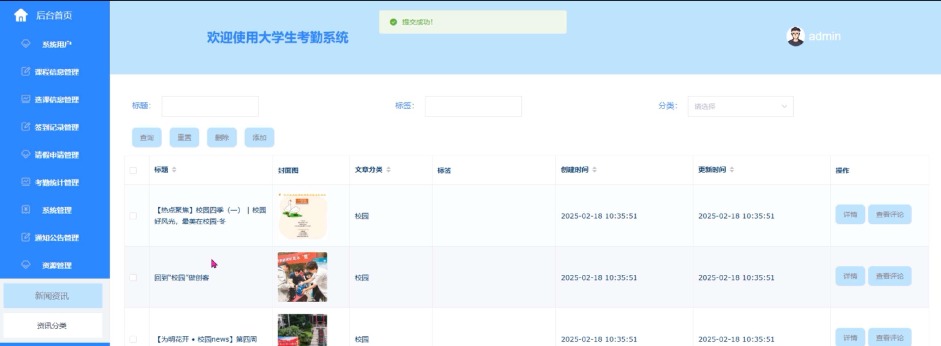 The system shows strong practicability and expansibility in practical application. Student users can view course information, submit leave applications and manage personal data through the system; Teacher users can conduct course management, attendance statistics and review student leave information; The administrator is responsible for overall system maintenance, including user management, resource management, and permission allocation. By integrating the functions of check-in record, leave application and attendance statistics, the system provides a comprehensive attendance solution for colleges and universities, effectively improves the efficiency of teaching management and information technology level, and provides strong support for the construction of smart campus.